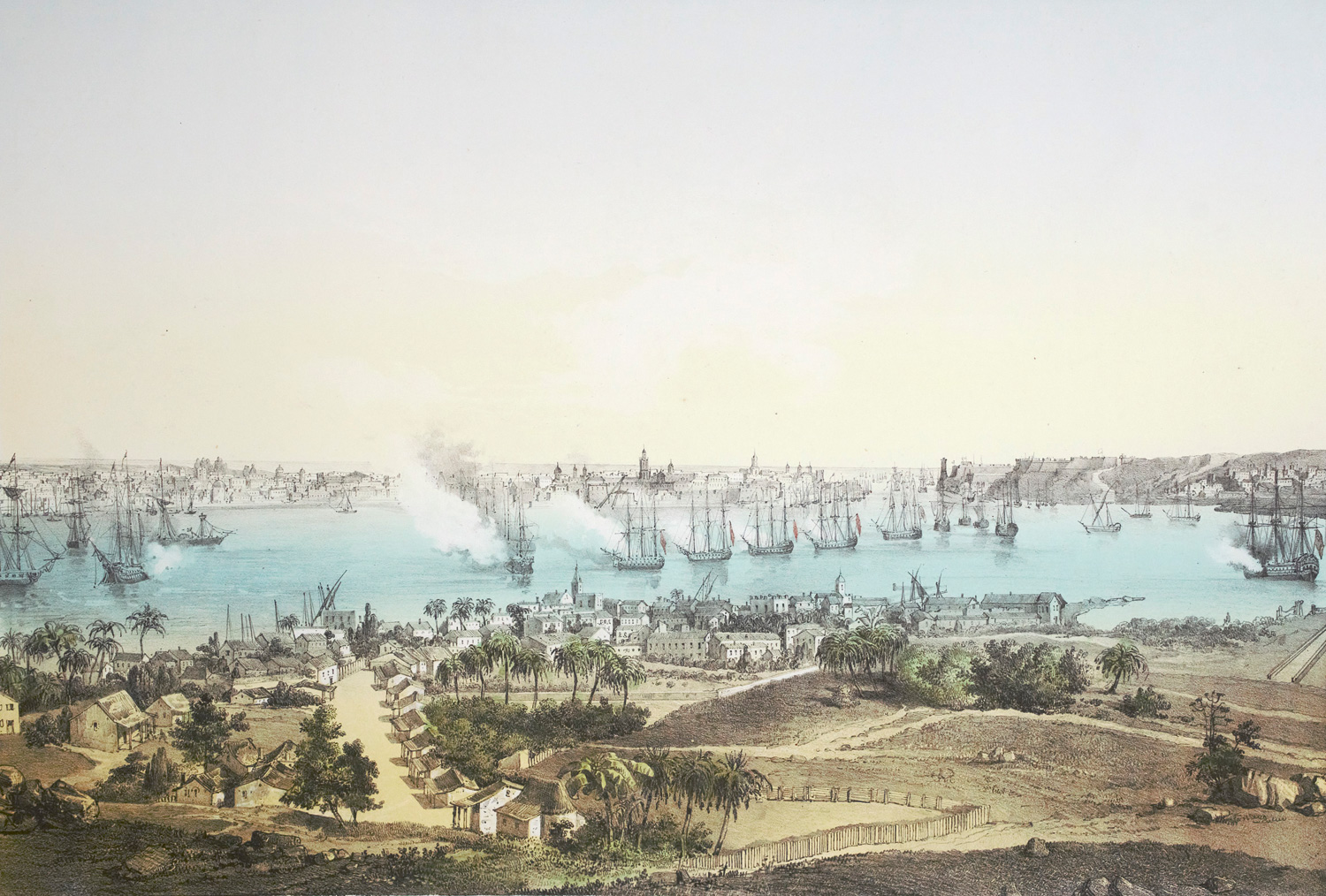 Die Ansicht von Vicente Urrabieta (1813-1879) zeigt den Hafen von Havana mit zahlreichen Schiffsstaffagen. – Etwas braunfleckig, mit hinterlegten kleinen Einrissen und minimal knickspurig. Dekorativ. Selten im Handel.