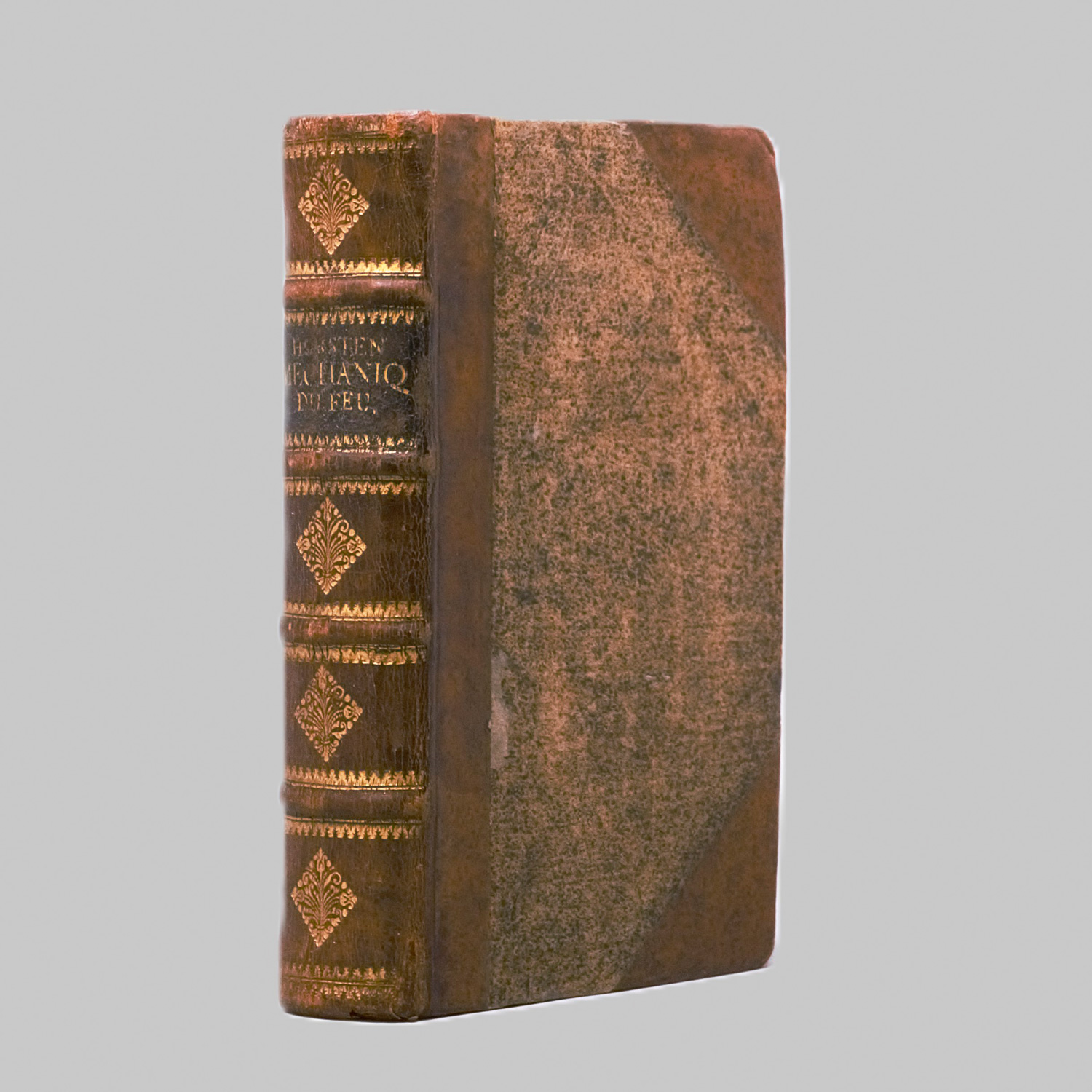 (Gauger, Nicolas). La méchanique du feu oder Kunst die Würckung des Feuers zu vermehren, und die Kosten davon zu verringern. Mittelst neu-erfundenen Caminen und Ofen. Anietzo in das Teutsche übersetzet, und mit einem Anhange von dergleichen neuen Erfindungen vermehret von Anthon Heinrich Horst. 7 Bl., 278 S., 25 (le. w.) Bl. Mit gestochenem Frontispiz 12 gefalteten Kupfertafeln. 16,5 x 10 cm. Halbleder d. Z. (leicht berieben). Hannover, Nicolaus Förster, 1715.