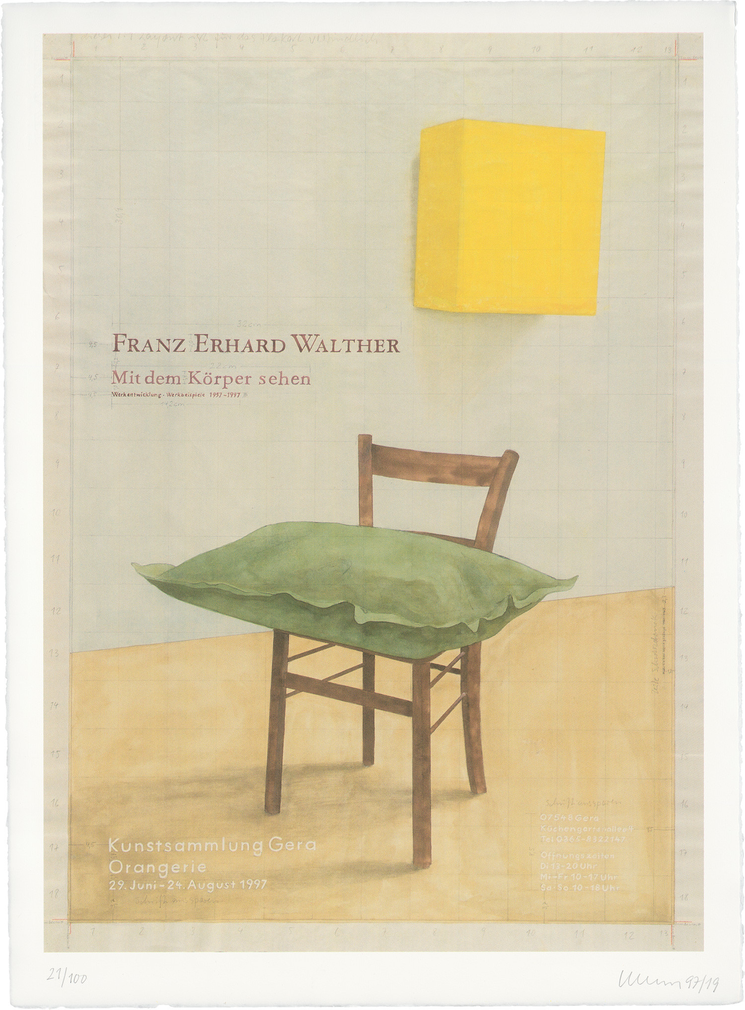 Erste Ausgabe, hier in einer Vorzugsausgabe mit 4 separaten signierten, nummerierten und datierten Original-Farbserigrafien von Franz Erhard Walther, auf BFK Rives 270g/m², Auflage 100 Exemplare, jeweils 76 x 55 cm. Die vier Motive stammen aus Plakatentwürfen des Künstlers und tragen die Titel "mit dem Körper sehen", 1997 / 2019, "Ich bin die Skulptur", 1986 / 2019, "Spaces", 1969 / 2019 und "Werkrede", 1992 / 2019. - "Franz Erhard Walther ist nichts weniger als ein Ausnahmekünstler im 20. Jahrhundert, der das, was ein Kunstwerk sein kann, konsequent hinterfragt und grundlegend verändert hat. Die innovative Kraft seines umfassenden Werkes wird natürlich in erster Linie durch seine Kunst deutlich, aber auch die vorliegende Publikation seiner vielfältigen Entwürfe gibt hierüber einen ebenso wunderbaren wie außergewöhnlichen Überblick." (Andreas Beitin, Direktor, Kunstmuseum Wolfsburg). – Tadellos.