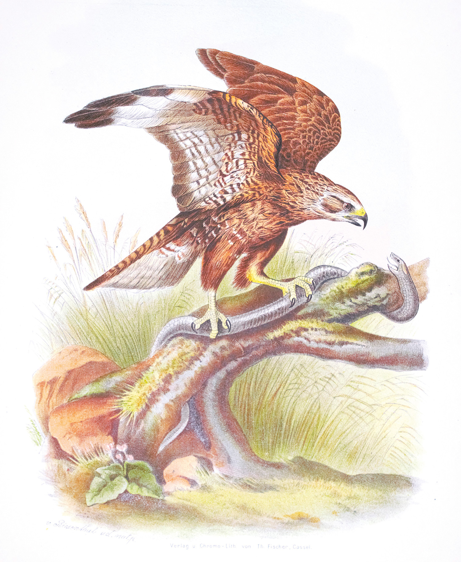 Nissen, Vogelbücher 782 und S. 72. Anker 422. – "Ein Prachtwerk, (...) das sich den englischen in künstlerischer Hinsicht an die Seite stellen kann, auch in der Ausführung der handkolorierten, bei Th. Fischer in Kassel lithographierten Reproduktionen." (Nissen, S. 72). Die dekorativen, sorgfältig ausgeführten Tafeln zeigen Adler, Eulen, Falken, Bussarde und Geier als Jung- und Alttiere in Gegenüberstellung oder als Vogelpaare in ihrer natürlichen Umgebung. Die Vögel werden mit ihren lateinischen und deutschen Bezeichnungen vorgestellt und teils beim Beutegreifen gezeigt. – Leicht gebräunt; insgesamt gutes Exemplar.