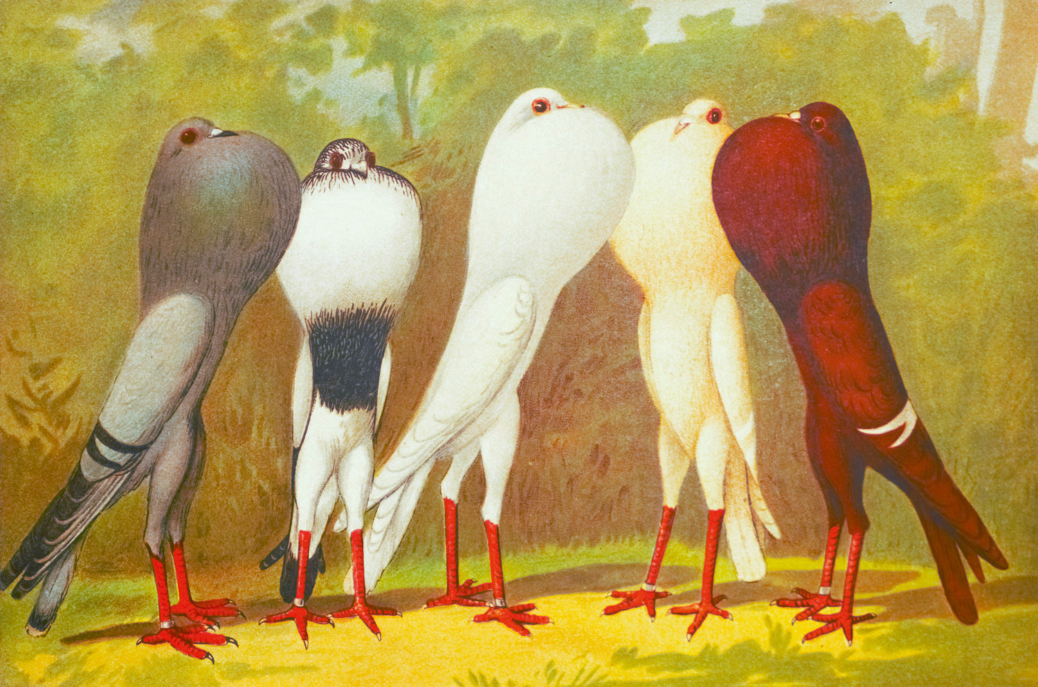 Nicht bei Nissen. – Erste Ausgabe des schönes Taubenbuchs mit den prächtigen Farbtafeln, die meist mehrere Tiere in Farbvarianten zeigen. Verso jeweils mit erläuterndem Text. – Textteil etwas fleckig, die Tafeln farbfrisch.