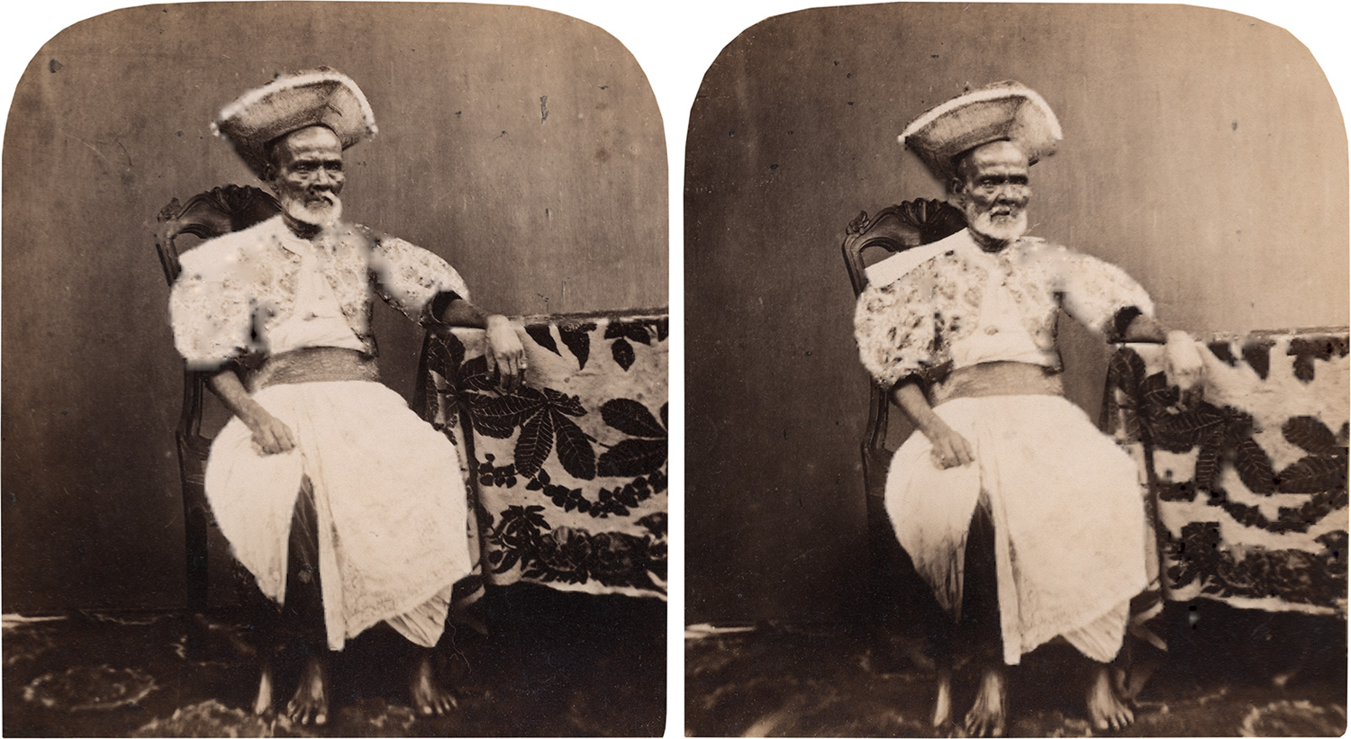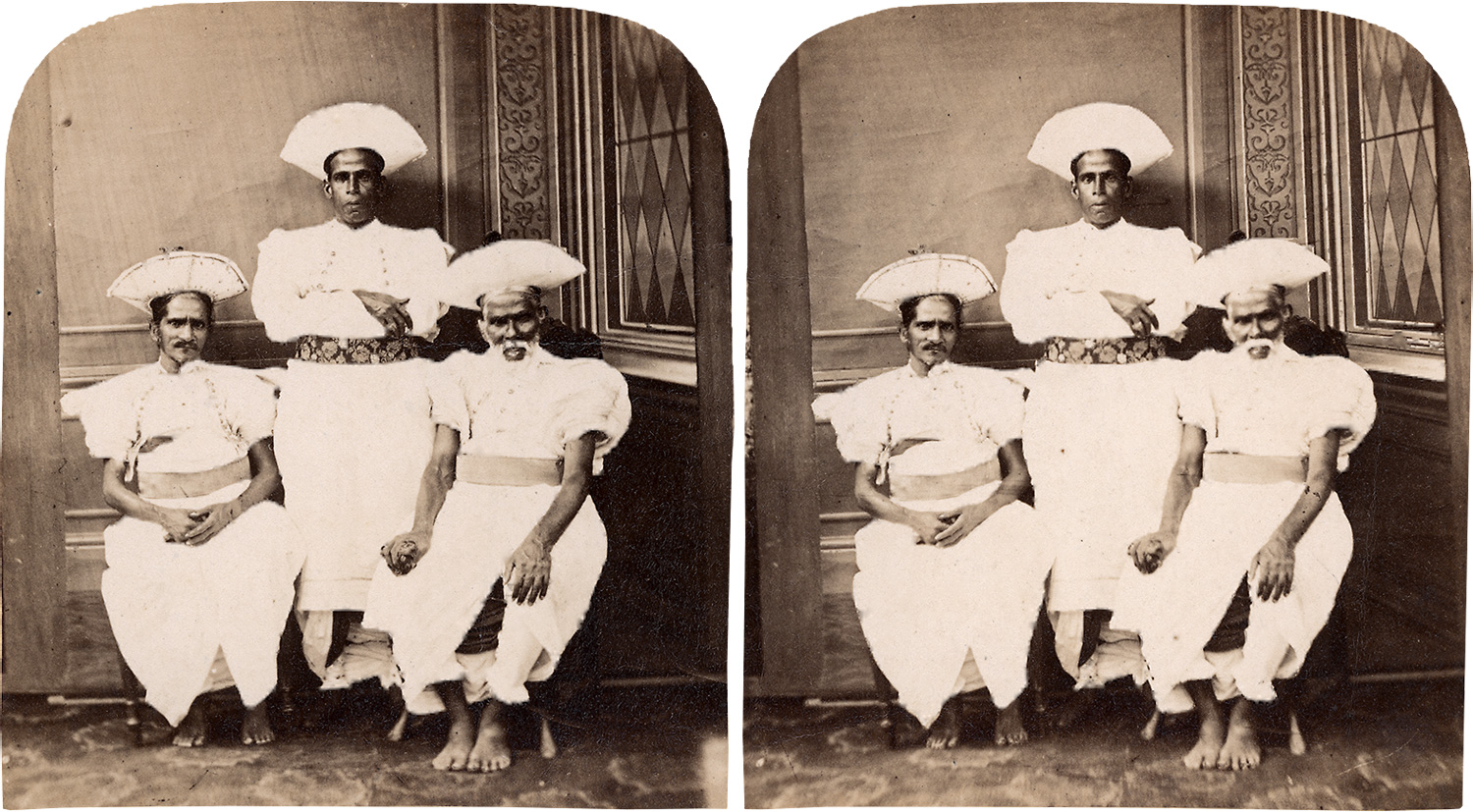 Photographer: J.D. Herbert (active ca. 1860-1885). Sinhalese temple dancers, chiefs, monks, craftsmen, and street performers. 1870s-1880s. 10 albumen stereoviews, mounted to yellow card stock. Each ca. 8,5 x 17,5 cm. With photographer’s studio stamp on the verso.