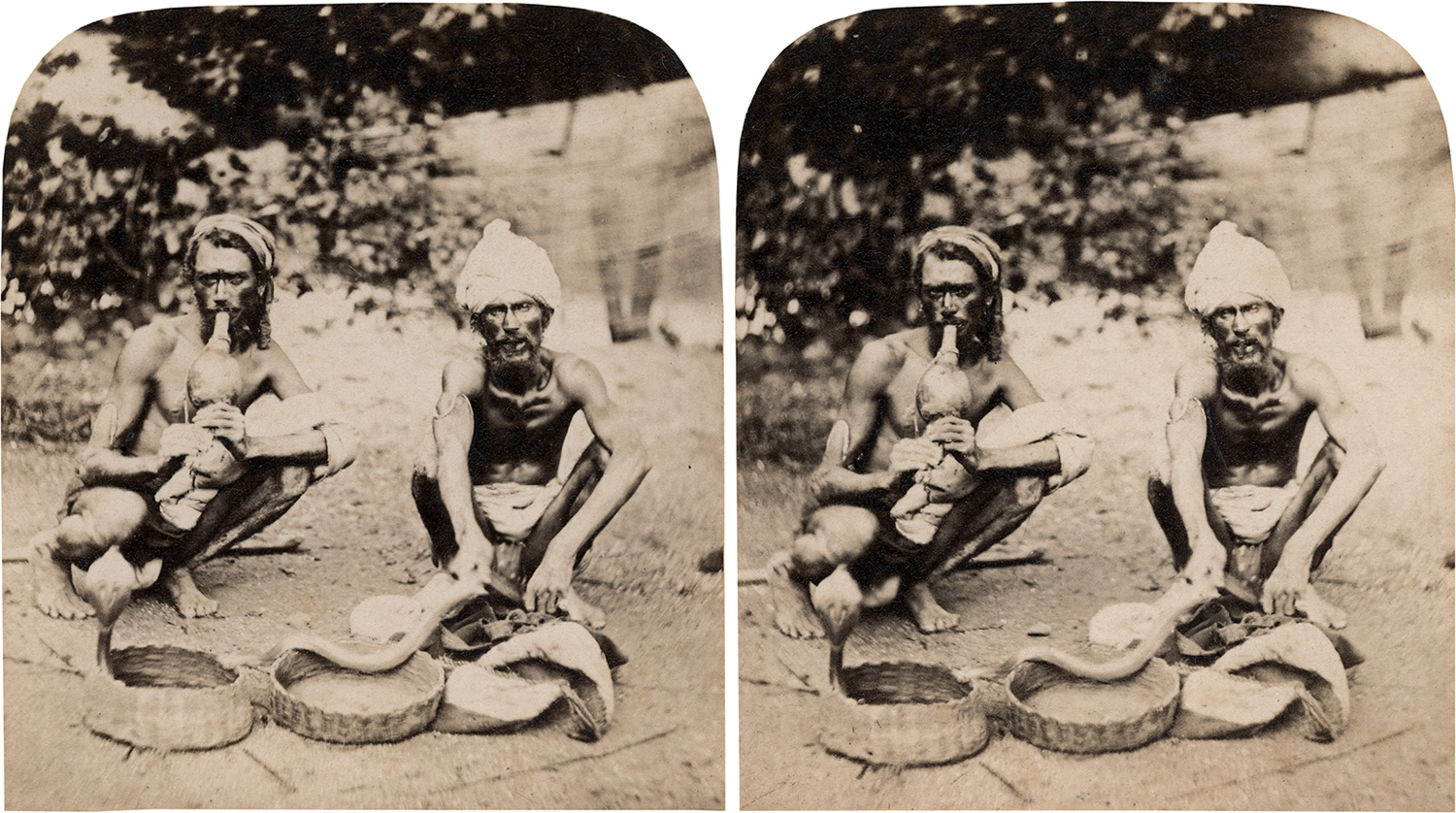 This group of stereoscopic photographs by J. D. Herbert offers a vivid and detailed visual survey of Sinhalese cultural and social life in late 19th-century Ceylon. Among the subjects are Kandyan dancers in elaborate ceremonial attire, Buddhist monks shown both seated beneath a ritual parasol and standing in formal pose, and temple musicians with traditional drums. Also featured are Tamil plantation workers and two snake charmers with live pythons and wind instruments. Seated portraits of high-ranking Sinhalese chiefs in traditional dress reflect the colonial fascination with indigenous elites. Carefully composed against painted or natural backdrops, the images blend ethnographic observation with the staged conventions of colonial photography. – Some scuff marks, some soiling and foxing of mounts, otherwise in very good condition.