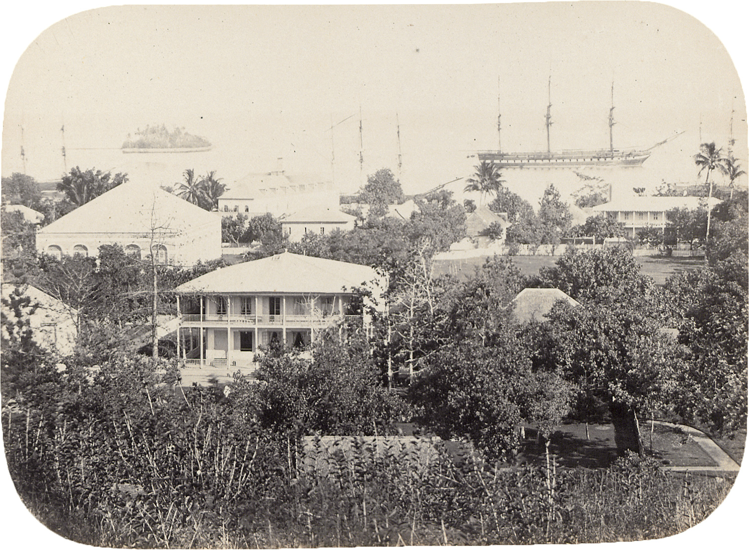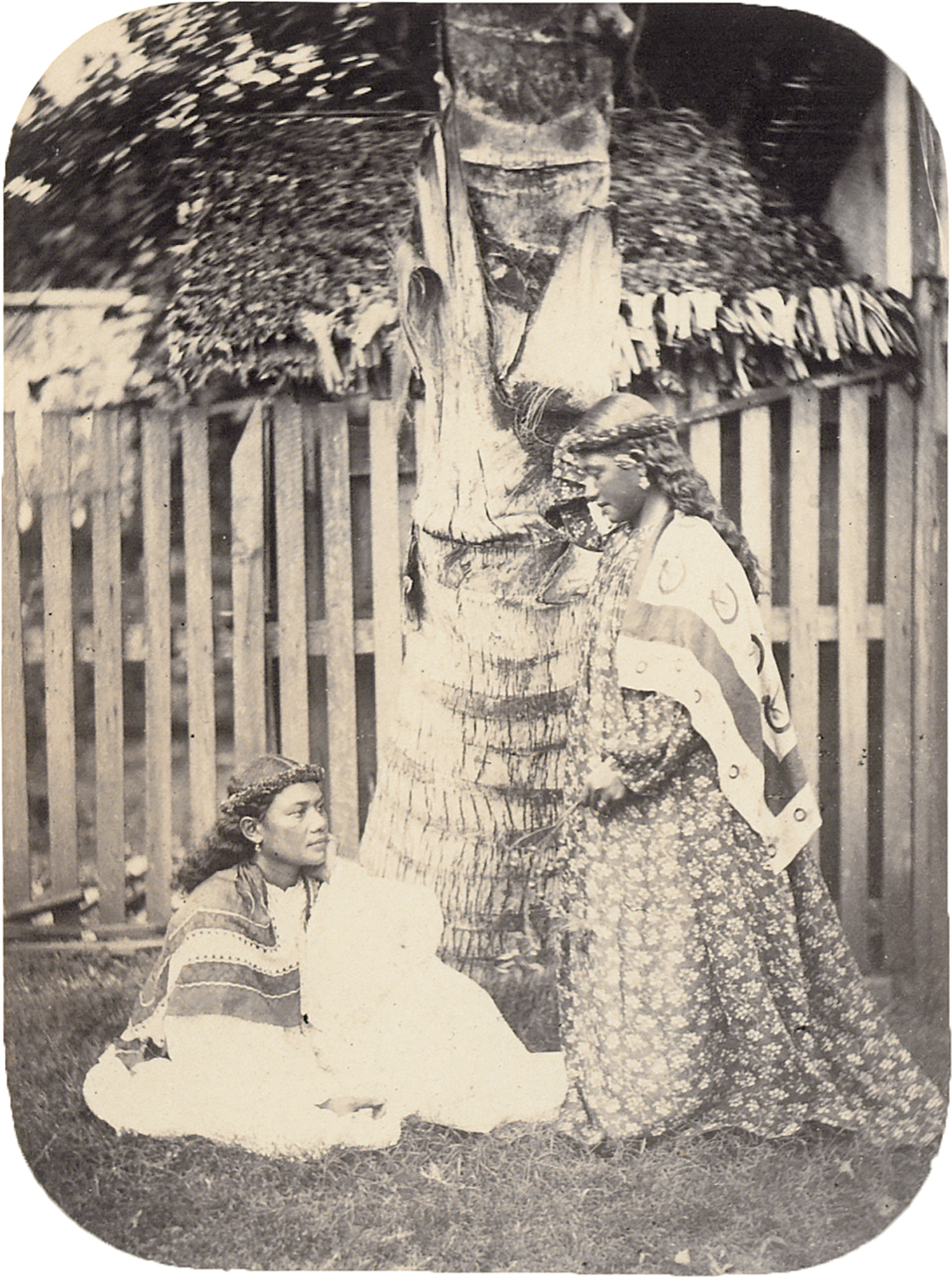 Compiled shortly after the founding of the Courret Hermanos studio in Lima in March 1863 by French-born brothers Hippolyte and Eugène Courret, this rare album presents one of the earliest photographic surveys of Tahiti and the Marquesas Islands. Within months of establishing their studio, the brothers embarked on an expedition to the South Pacific, arriving in Tahiti in September that same year. Their photographs strike a balance between studio-style portraiture and documentary views, capturing full-length images of Tahitian and Marquesan men and women - some in traditional dress, others in Western attire - as well as expansive scenes of Papeete’s streets, including the royal palace of Queen Pōmare IV, the colonial hospital, and Rue de Rivoli. Views from Nuku Hiva include Taiohae’s government buildings and Fort Collet. Marked by formal clarity and ethnographic detail, the album documents a pivotal moment in the colonial transformation of French Polynesia, as seen through the lens of recently arrived French photographers working far beyond their Lima base. – Album cover with some scuff marks, stains, and wear to edges and corners. Inner mounts with smudge marks, small tears, and edge wear. Some prints with some small surface irregularities and slight fading, particularly around the edges. Overall in good condition, with a strong tonal range preserved across most images. With: 7 carte-de-visite portraits of Tahitians.