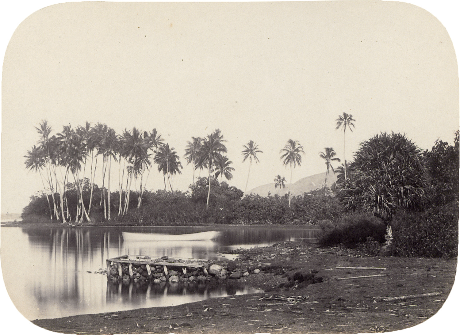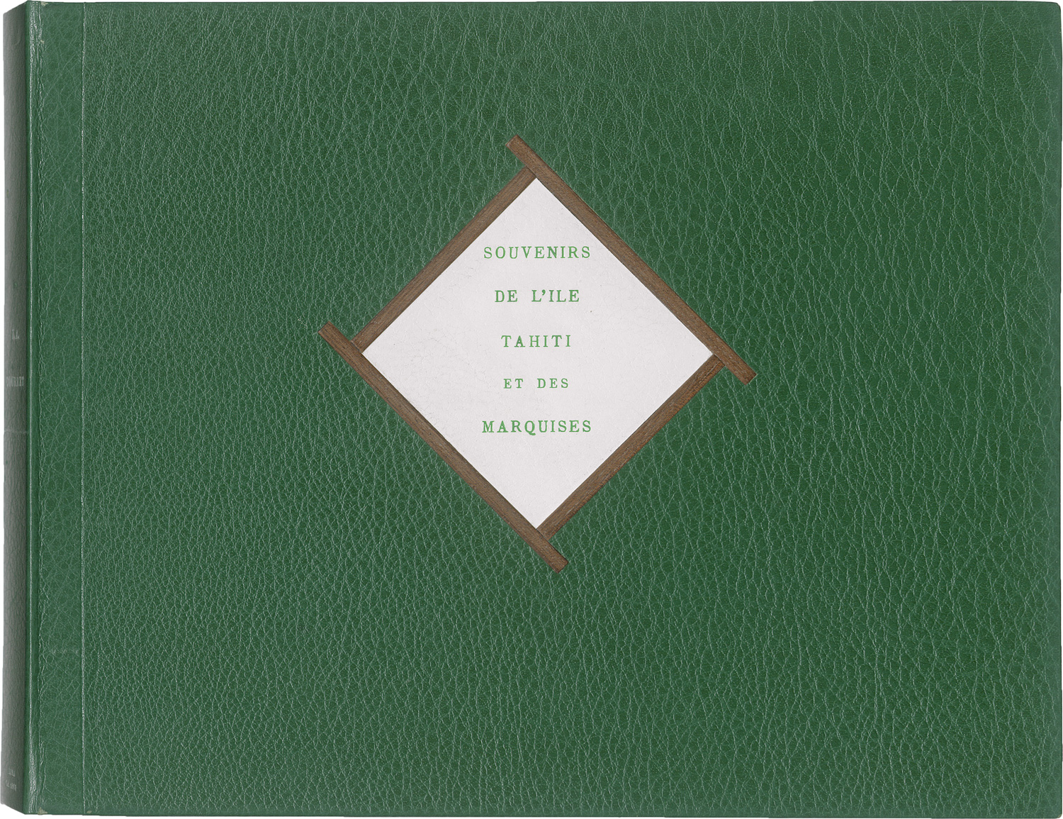 Souvenirs de l’Ile Tahiti et des Marquises. 1863. 21 albumen prints, mounted to album pages. Each ca. 11 x 15,5 cm or reverse (22 x 29 cm). Each with “Courret Hermanos Fotógrafos Calle Mercaderes 197, Lima” blind stamp on the mount, annotated in black ink below the image. Bound in green half-leather album with gilt-stamped title "Souvenirs de l’Ile Tahiti et des Marquises" in rhombus cartouche on front cover. Housed in a custom clamshell box covered in green faux-leather with mounted printed title label bordered by four diamond-shaped wooden inlays (entire size 30 x 41 cm).