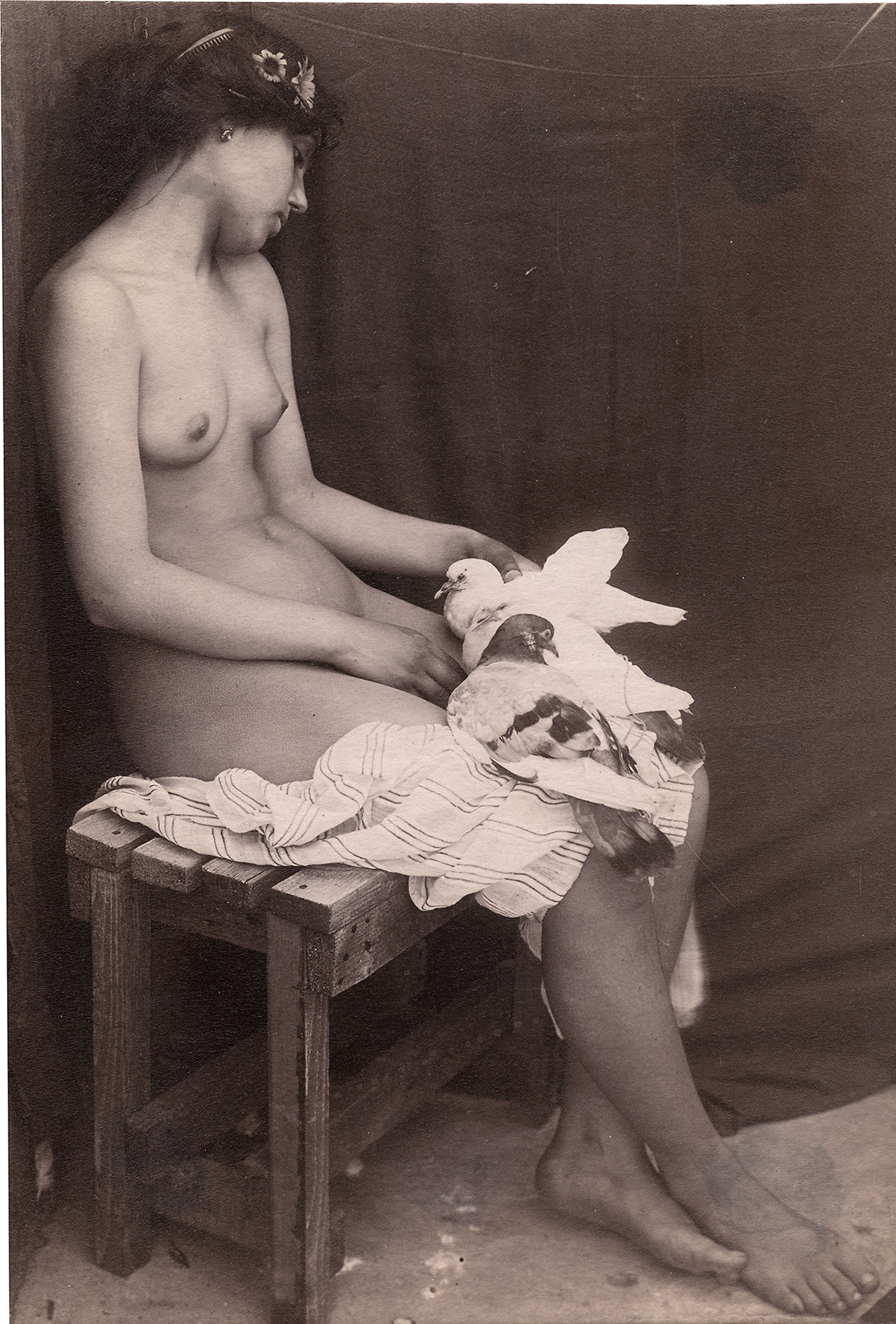 Seated nude with doves. Ca. 1910. Albumen print. 20 x 13,2 cm. Photographer’s “Proprietà Artistica: Vincenzo Galdi, Via Sardegna, 55, Roma” studio stamp on the verso.