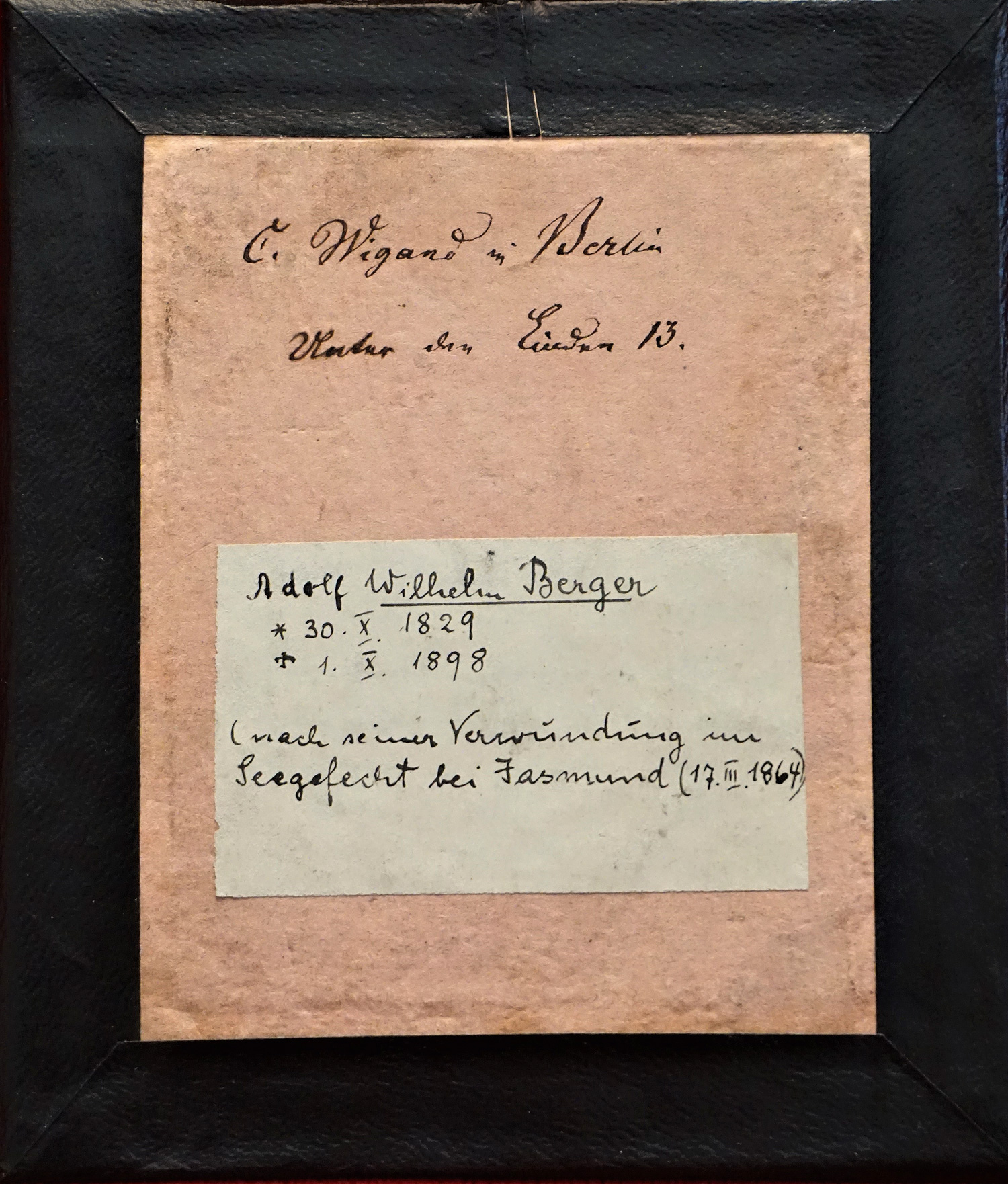 Further instruction followed in 1863-64, when Berger trained aboard H.M.S. Black Prince with the British Royal Navy. He sustained serious injuries during the Second Schleswig War in 1864 while serving on the Arcona. Between 1867-1877, he commanded several vessels, including the Musquito, Niobe, Hansa, Renown, and the armored frigate Friedrich Carl. He ultimately rose to the rank of Vice Admiral, marking a distinguished career in the formative years of the Prussian and later Imperial German Navy. – Tarnishing in edges, otherwise in very good condition.