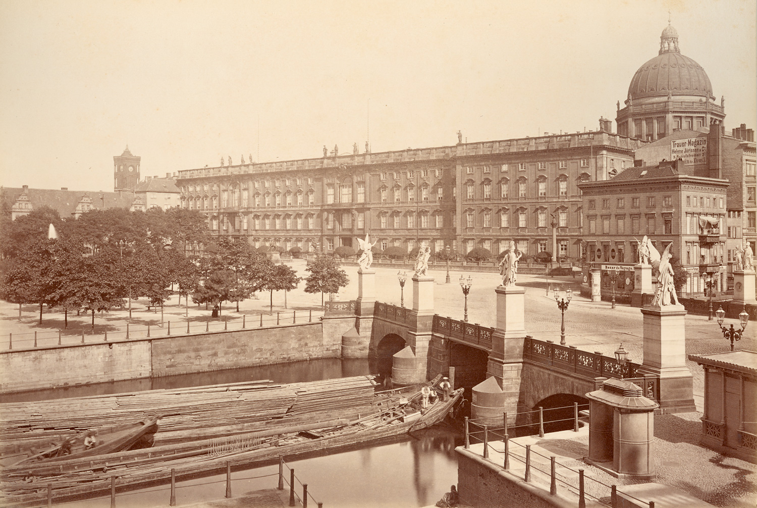 A comprehensive visual survey of Berlin in the late 19th century, this rare compilation presents a wide array of architectural and urban views, many of which depict structures no longer extant. Among the highlights are detailed exterior and interior photographs of the Stadtschloß, the Lustgarten with the old Domkirche, and several now-lost official buildings along Unter den Linden. The album further includes rare views of the historic bridges and canals around Fischerinsel, the monumental ensemble of the Museumsinsel, the Neue Synagoge on Oranienburger Straße, and the Kaiser-Passage with its famed Panoptikum. Also featured are tranquil scenes from the Tiergarten, the Flora in Charlottenburg, and several newly built railway stations, reflecting the city’s rapid modernization. Together, the images offer a richly detailed record of Berlin’s architectural heritage at a moment of imperial grandeur and transformation. – Several boards with small tears; a few prints with minimal edge fading, light surface abrasion, or small retouched spots. Otherwise, the prints are strong, with fine detail, and overall in good to very good condition.