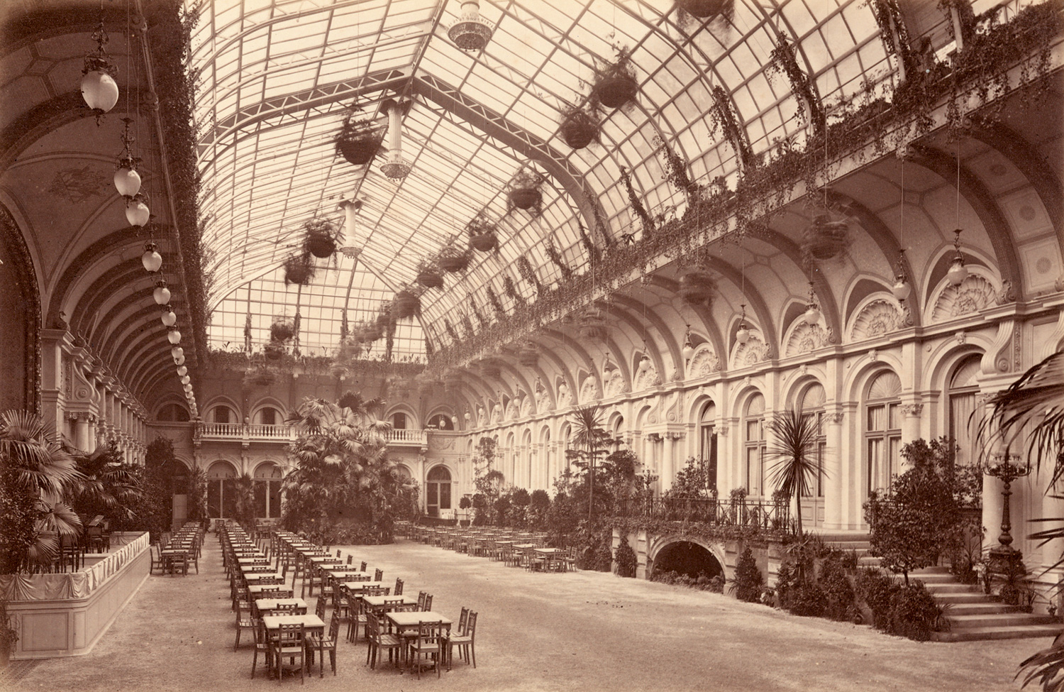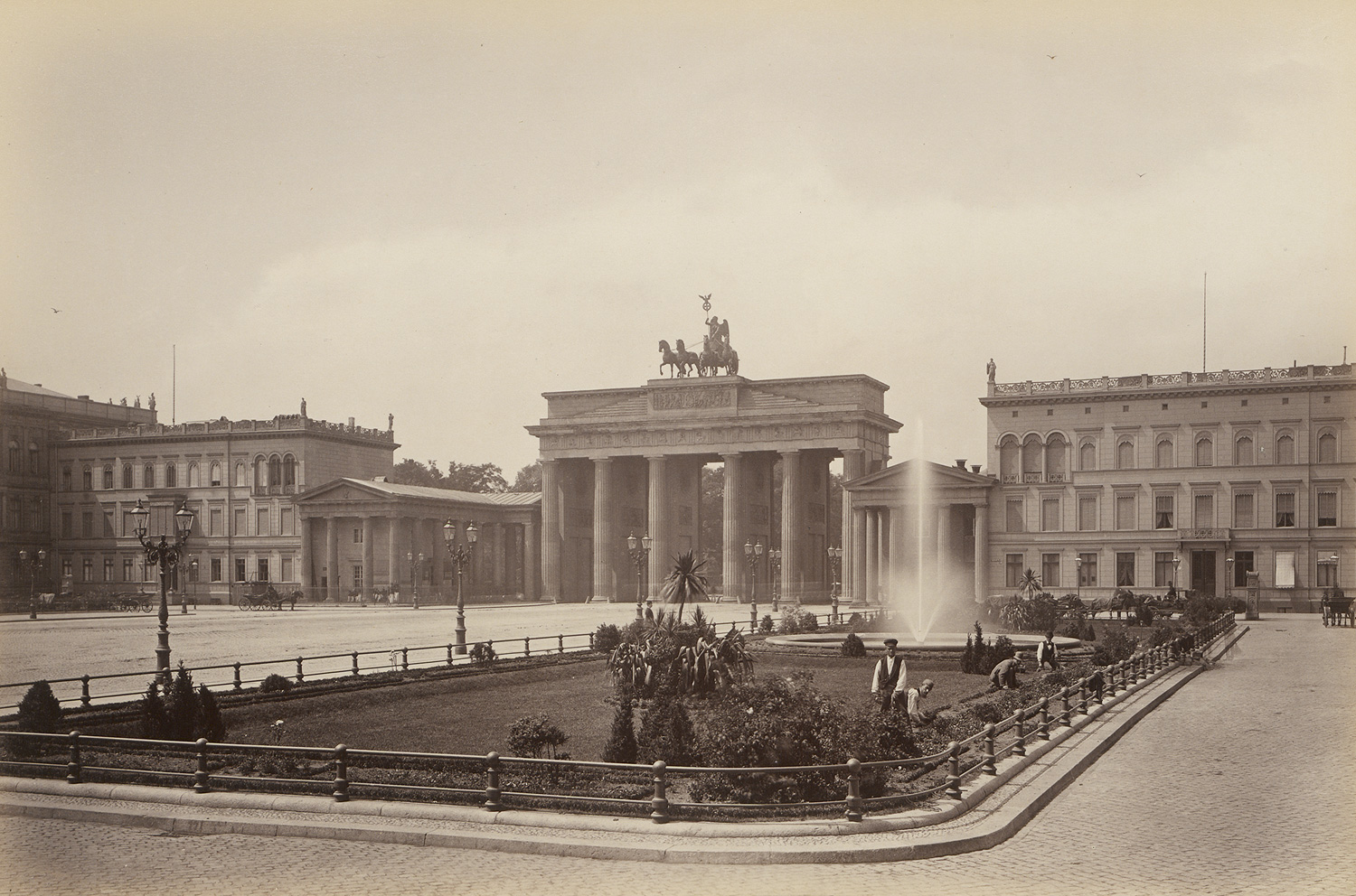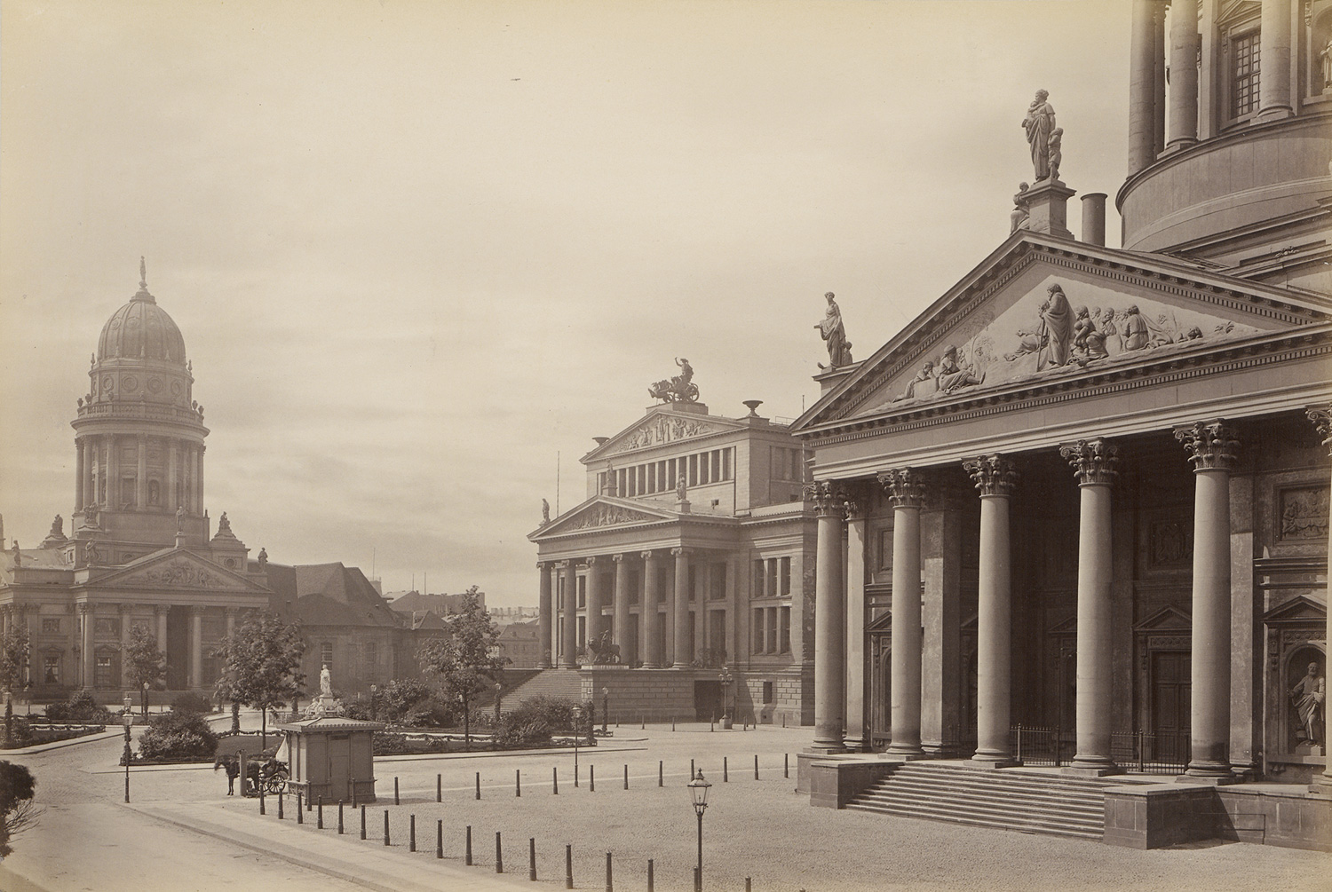 Berlin und seine Umgebung in Architektur, Landschaft und Plastik (Format IV). 1879-1882. 69 albumen prints, mounted to boards. Each ca. 21,5 x 32 cm or reverse (36 x 49 cm). Each with photographer’s studio information, title, date, and architect’s name printed in letterpress below the image on the mount. Presented in original wooden box with leather covering, gilt tooling, and gilt-embossed title on the lid.
