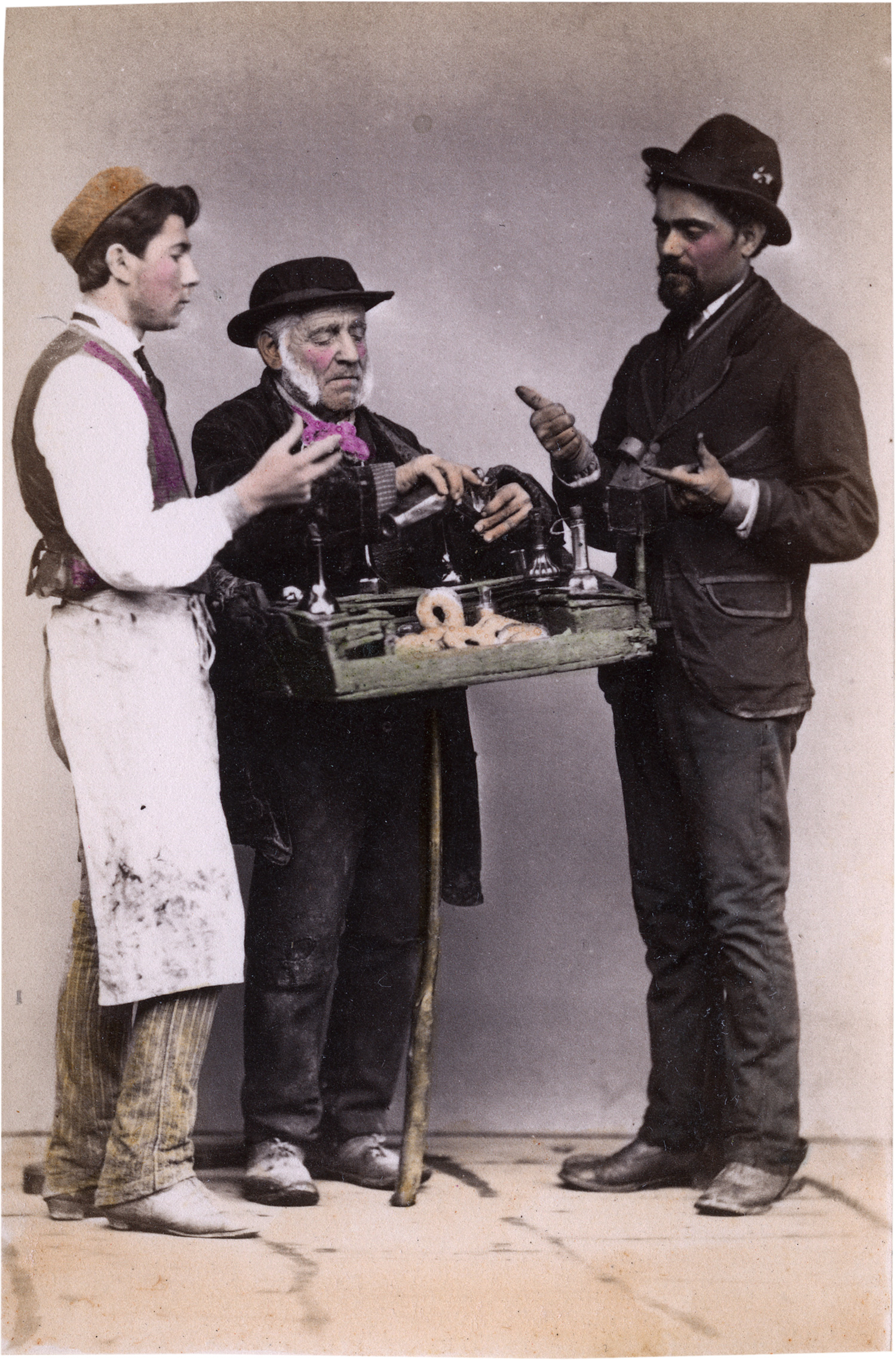 Neapolitan street peddlers. 1870s. 24 hand-colored albumen prints, mounted to decorative gold-bordered card. Each ca. 9 x 6 cm (14 x 11,5 cm). Some with number in the negative in lower margin.