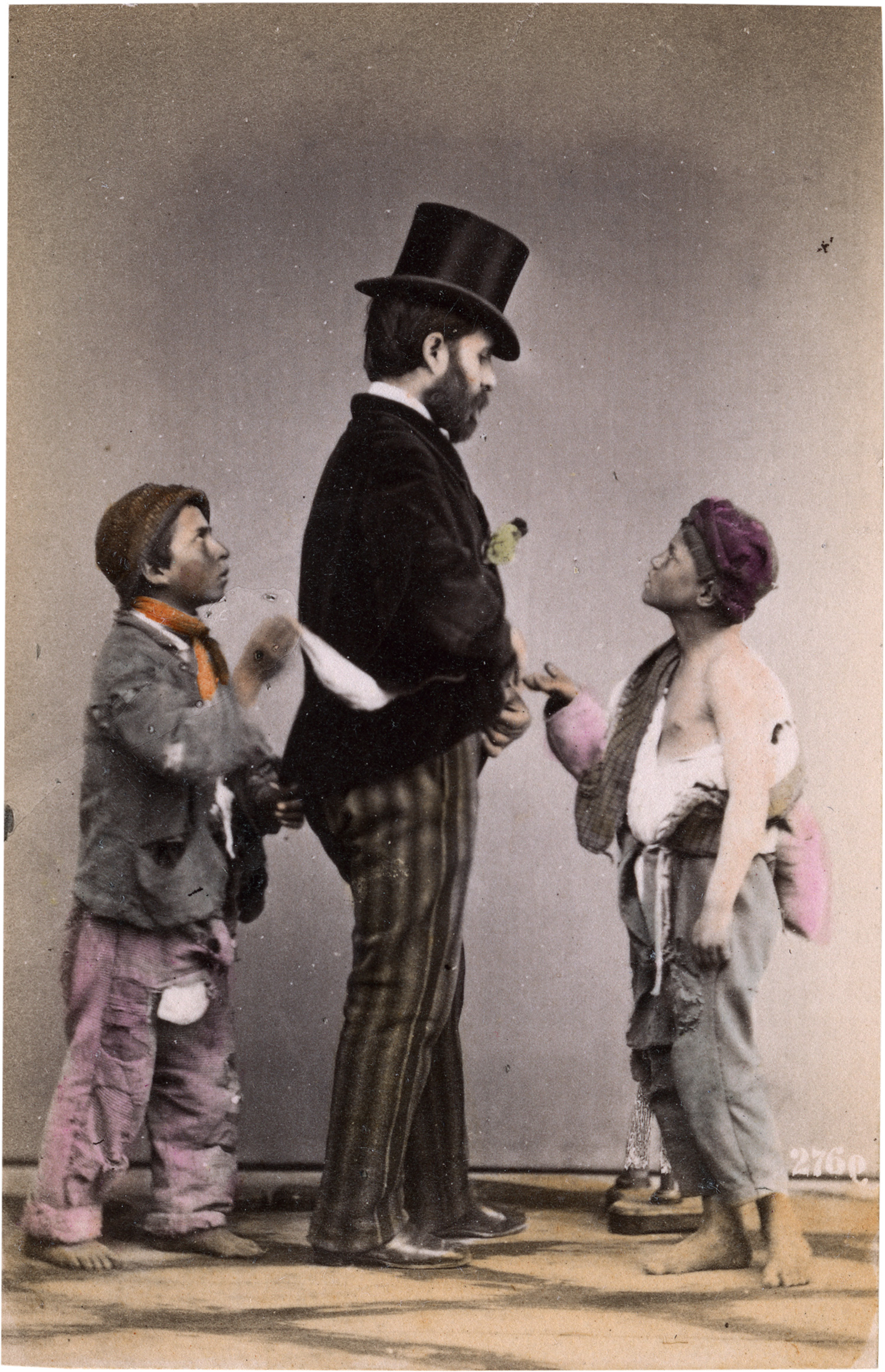 This group of hand-colored photographs presents a vivid cross-section of everyday working life in 19th-century Naples. Shown are street vendors, performers, beggars, and artisans - each depicted with their characteristic tools, costumes, or wares, from fishmongers and launderers to cobblers and textile sellers. Carefully staged and richly hand-tinted, the prints belong to a genre popular among foreign travelers, offering romanticized yet documentary portrayals of local Neapolitan “types.” – Some minor scuff marks and surface irregularities as well as occasional foxing and edge wear to mounts, otherwise all in near excellent condition with well-preserved color and strong tonal range.