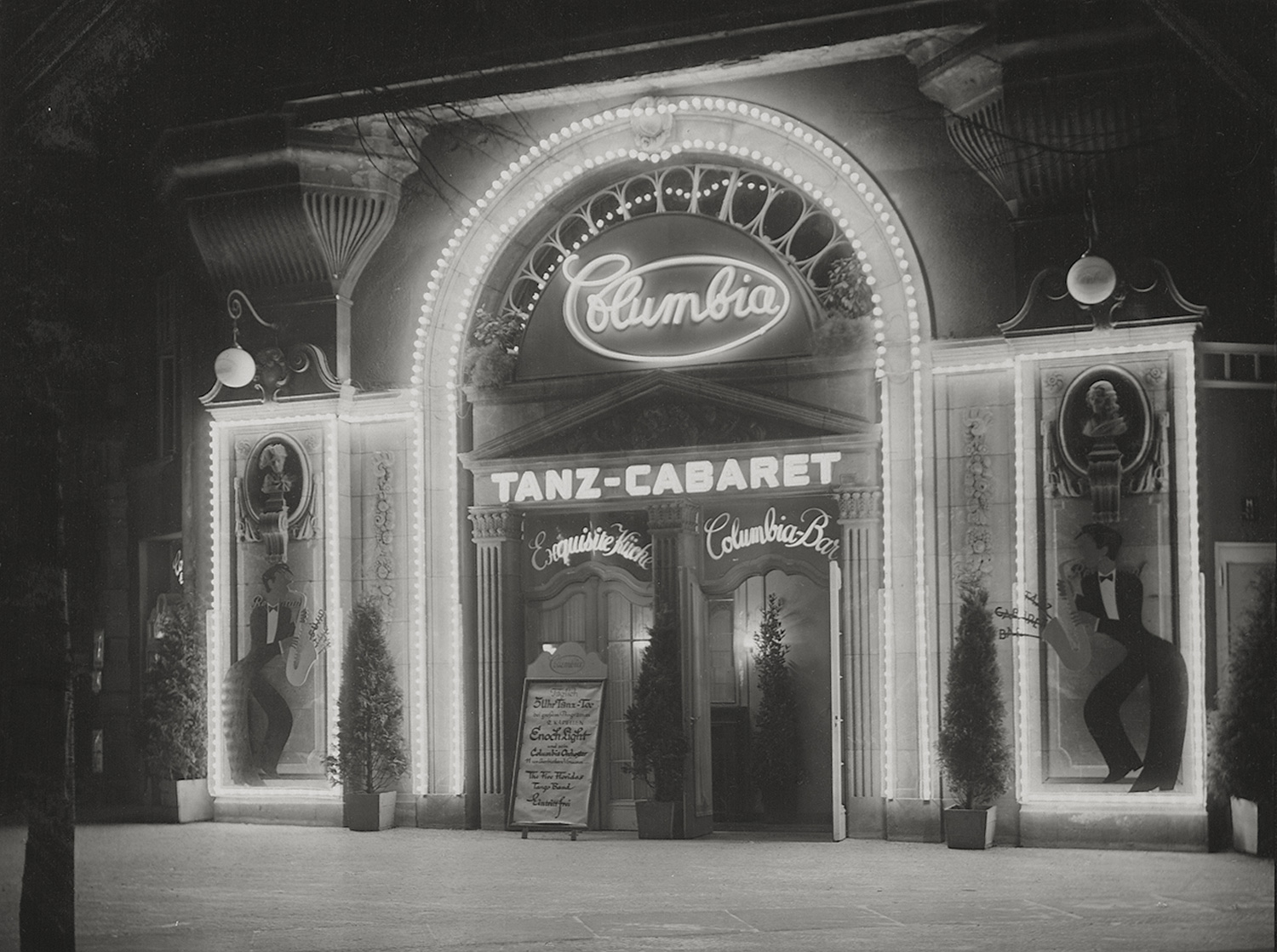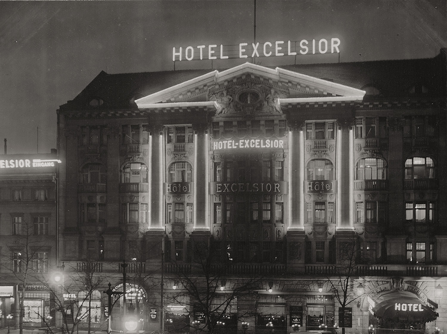 Further images document illuminated retail displays, signage, and advertising columns - including the Berlin im Licht column at Großer Stern and the well-known Persil column at Potsdamer Platz. Also represented are cinemas such as the Ufa-Pavillon at Nollendorfplatz (Oskar Kaufmann), the Ufa-Palast on Hardenbergstraße, and the Titania-Palast in Steglitz (Schoffler, Schlönbach & Jacobi). The album also includes hotels like the Excelsior near Anhalter Bahnhof (Otto Rehnig), and entertainment venues such as Potsdamer Platz with Haus Vaterland (Franz Schwechten) and the Columbia Tanz-Cabaret. – Slight toning in edges of album pages; binding edges and corners slightly rubbed with a few light surface scratches. All photographs with light pressure marks in corners from album slits, some with silver mirroring in edges and corners, some with light handling marks/creases, a few with surface scuff marks, otherwise most in good to very good condition.