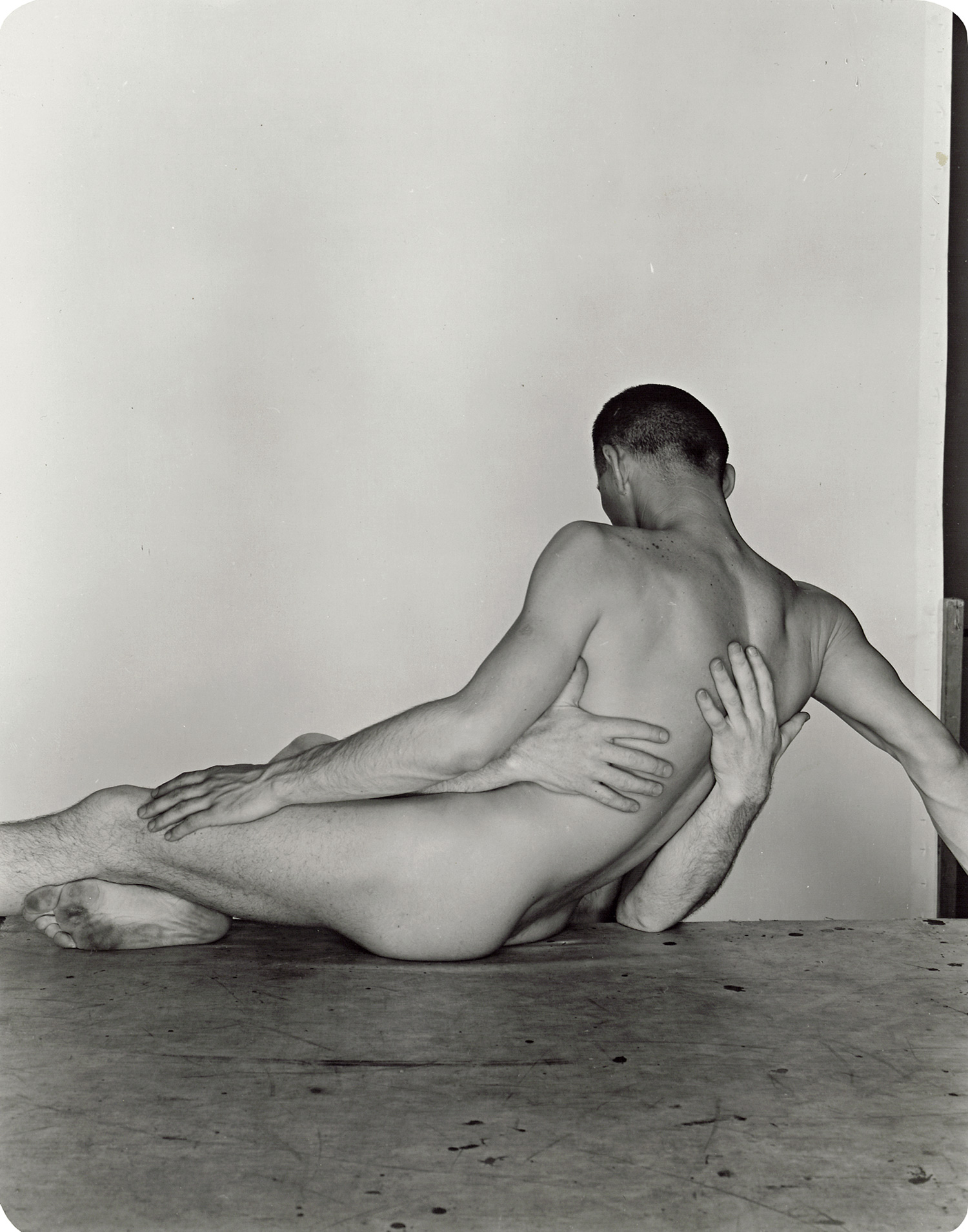 Male nude embraced. Early 1950s. Vintage gelatin silver print, hinge-mounted in upper edge in mat. 25,5 x 20,5 cm. With the photographer's studio stamp and "Collection of John Edward Rollins" stamp, as well as annotated by another hand in pencil on the verso.