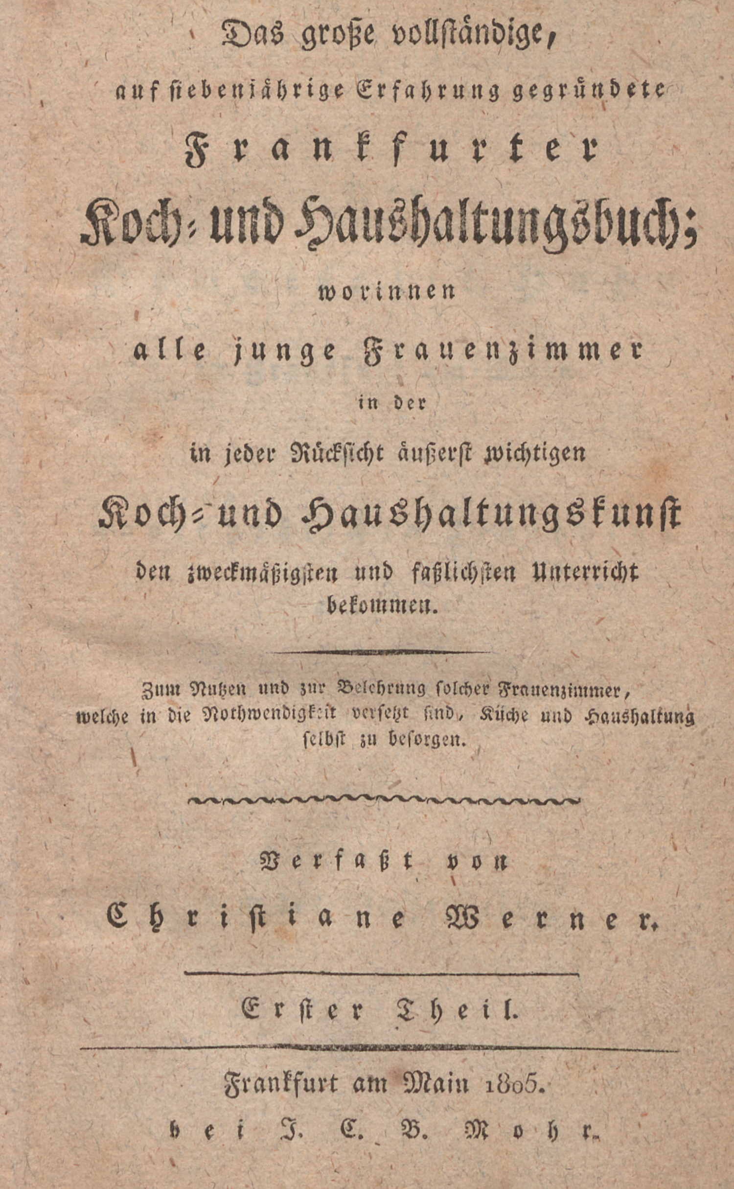 Werner, Christiane. Das große vollständige, auf siebenjährige Erfahrung gegründete Frankfurter Koch- und Haushaltungsbuch; worinnen alle junge Frauenzimmer in der in jeder Rücksicht äußerst wichtigen Koch- und Haushaltungskunst den zweckmäßigsten und faßlichsten Unterricht bekommen. 2 Teile in 1 Bd. XII, 412 S.; 1 Bl., 482 S. 17 x 11 cm. Pappband d. Z. (etwas berieben). Frankfurt a. M., J. C. B. Mohr, 1805.