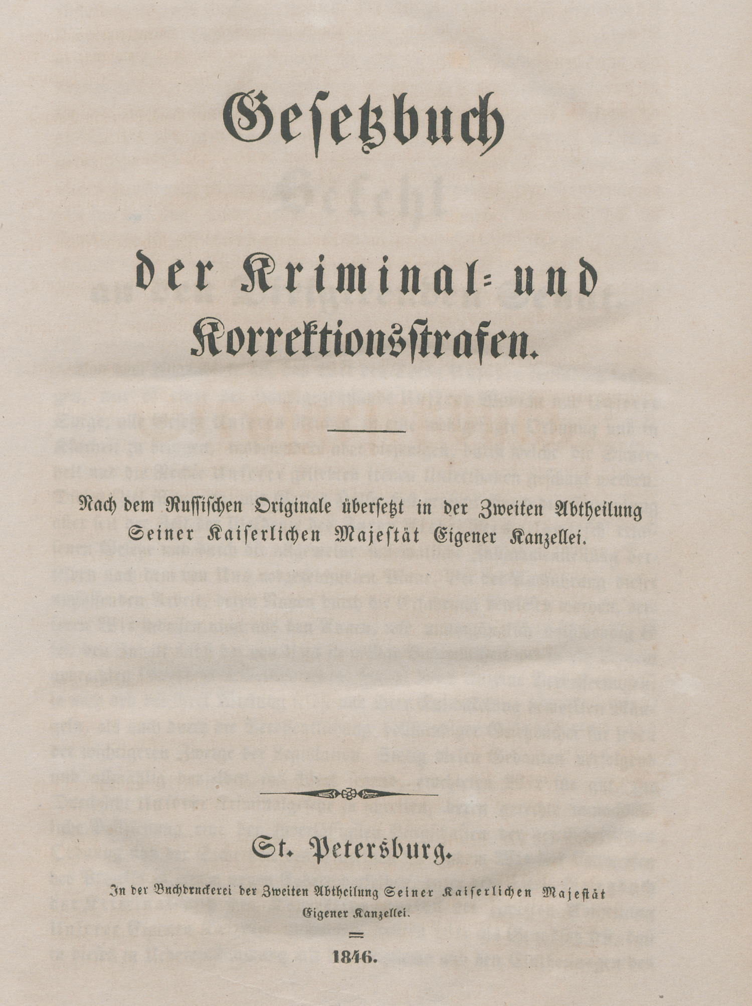 Gesetzbuch der Kriminal- und Korrektionsstrafen. Nach dem russischen Originale übersetzt in der Zweiten Abtheilung Seiner Kaiserlichen Majestät eigener Kanzellei. 4 nn. Bl., 544S. , XV. 25,5 x 16 cm. Leinen d. Z. (verblichen, berieben, bestoßen sowie fleckig und mit Fehlstelle) mit RTitel. St. Petersburg, Zweite Abtheilung seiner kaiserlichen Majestät, 1846.