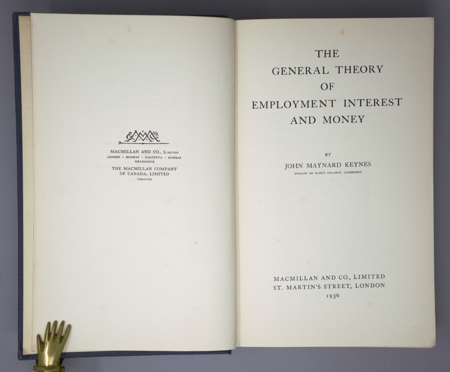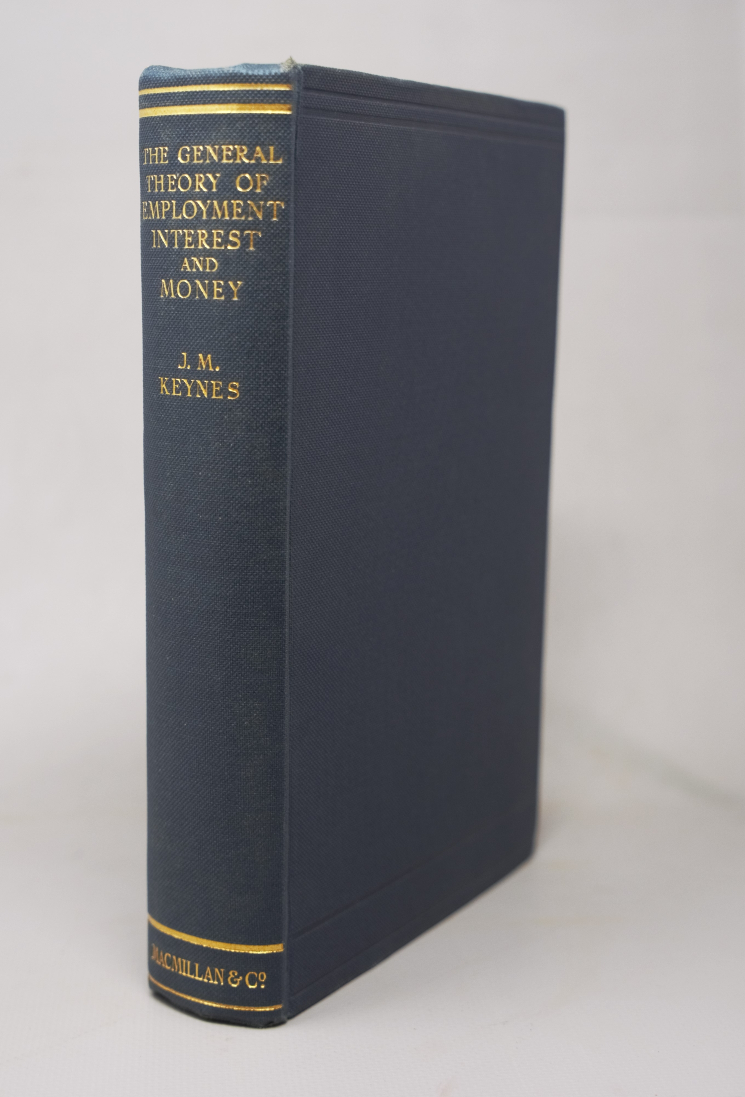 Keynes, John Maynard. The general theory of employment, interest and money. 1 Bl., XII, 403 S. 21,5 x 13,5 cm. OLeinen mit goldgepr. RTitel und OSchutzumschlag (mit kleineren Randläsuren). London, Macmillan and Co., 1936.