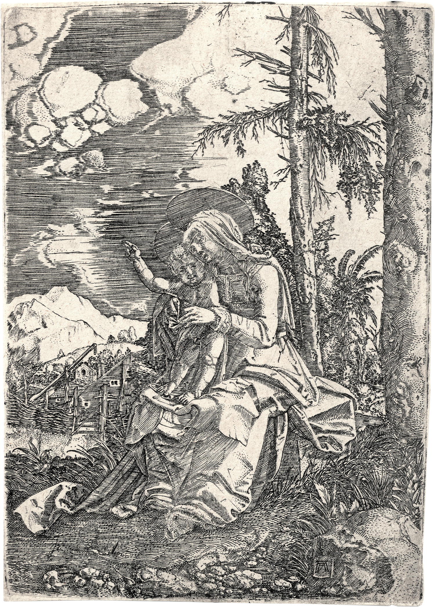 Der größte Kupferstich Altdorfers vor Beschädigung des Gesichts des Christusknaben, die in späteren Abzügen bemerkbar wird. Ausgezeichneter Druck mit sehr feinem Rändchen um die Plattenkante. Etwas angestaubt, unten links kurzer hinterlegter Randeinriss, unbedeutende Anfaserungen in den äußersten Rändern, kleine Alters- und Gebrauchsspuren, sonst in sehr schöner Erhaltung.