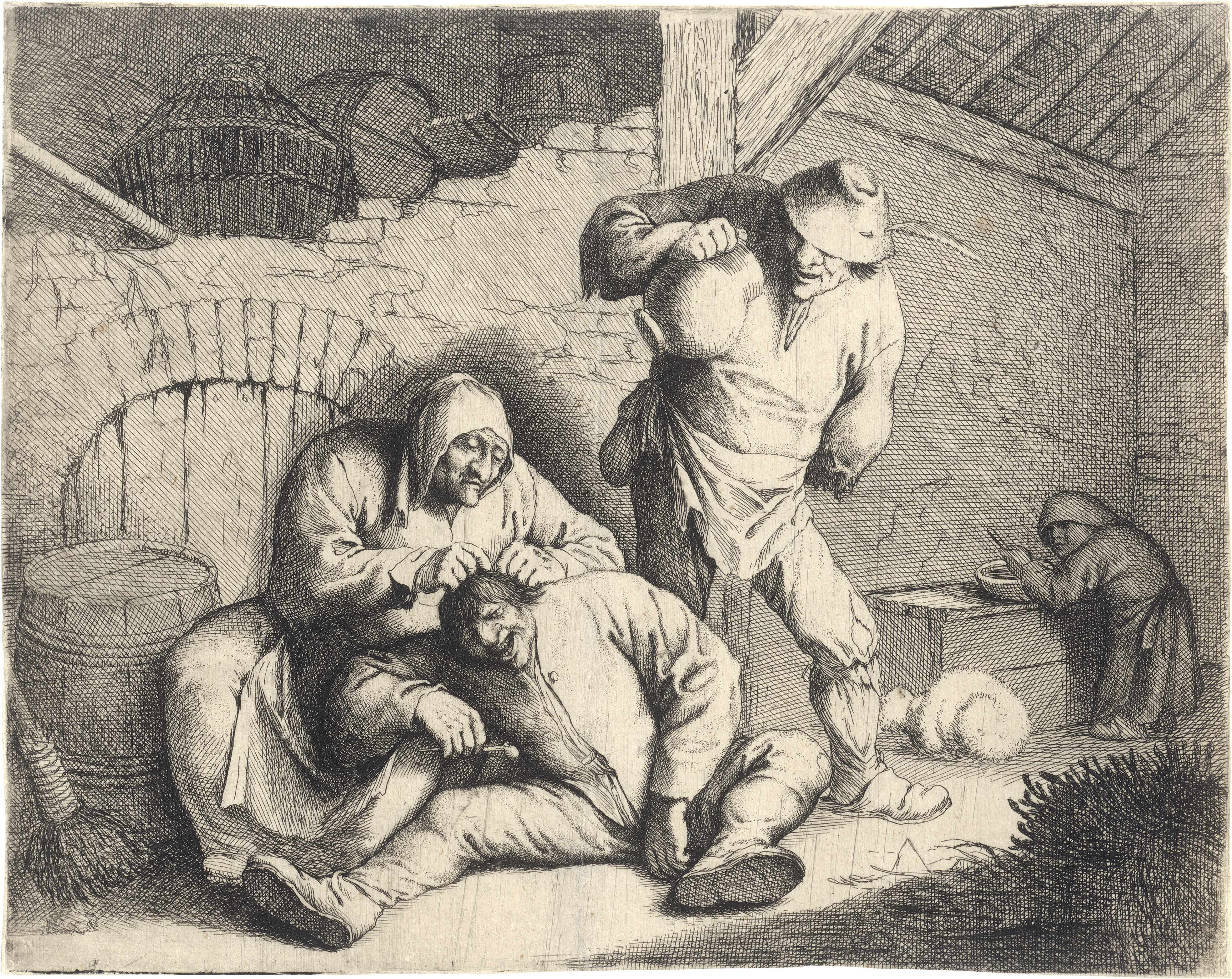 L'Épouilleuse (Die lausende Bäuerin). Radierung nach Anthonie Victorijns. 15,2 x 19,4 cm. B. (Ostade) 35, Hollstein (attributed to A. van Ostade) A II, Hollstein (Basse) 32 II. Wz. Doppelkopfadler (Fragment).