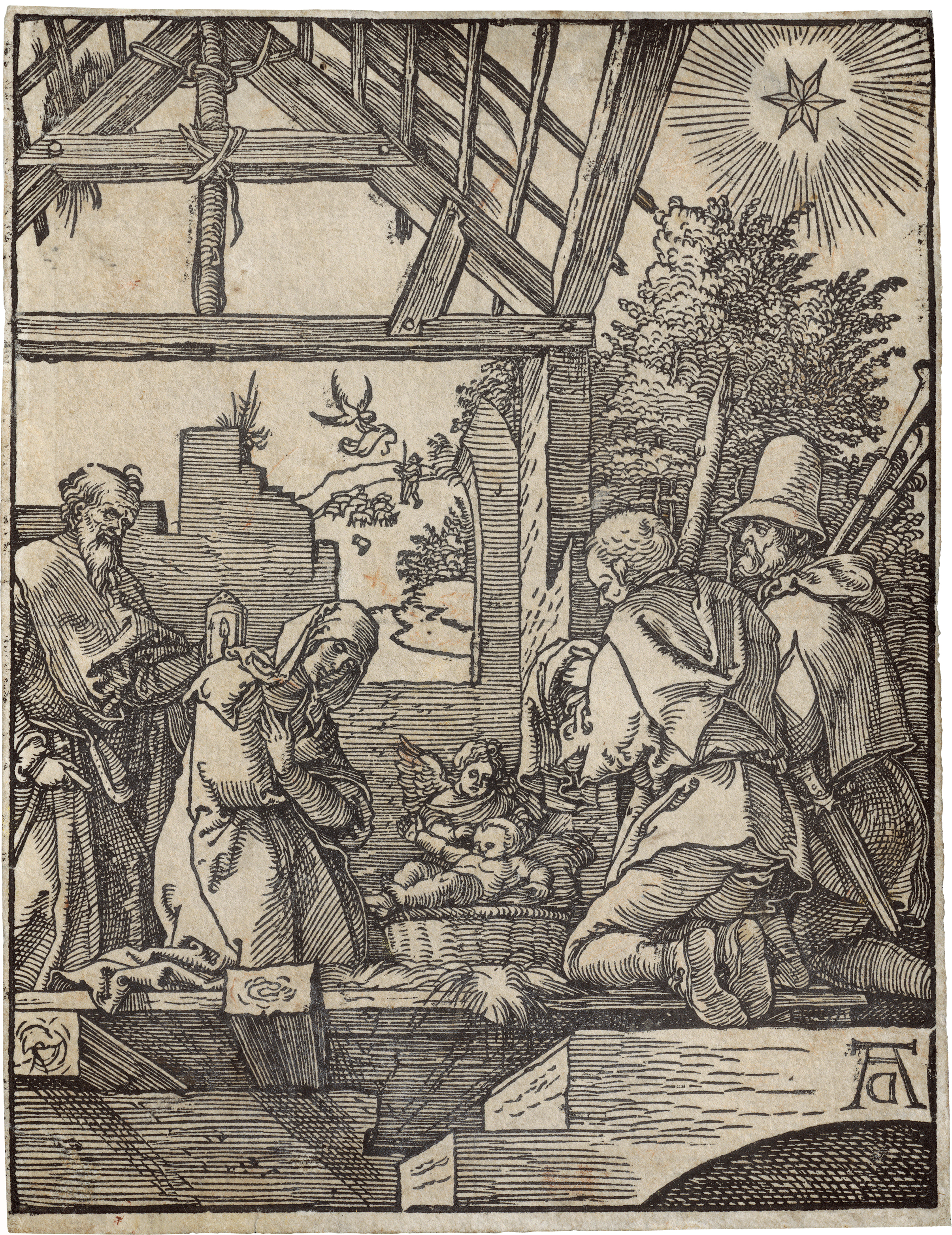 Die Geburt Christi. Holzschnitt aus der Kleinen Holzschnittpassion, wie auch die folgenden vier Losnummern. 12,8 x 9,9 cm. Um 1509-1511. B. 20, Meder 129, Ausgaben ohne Text, wohl c.