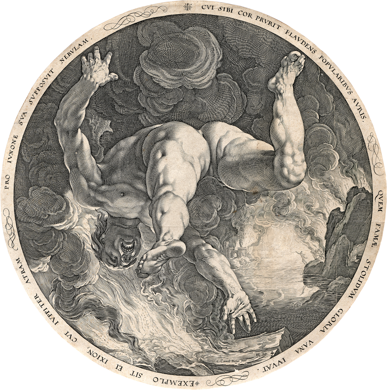 Der Sturz des Ixion. Kupferstich nach Cornelis Cornelisz. van Haarlem. Kupferstich im Rund. D. 33,4 cm. (1588). B. 261, Hollstein 309, Leesberg (New Hollstein) 328.