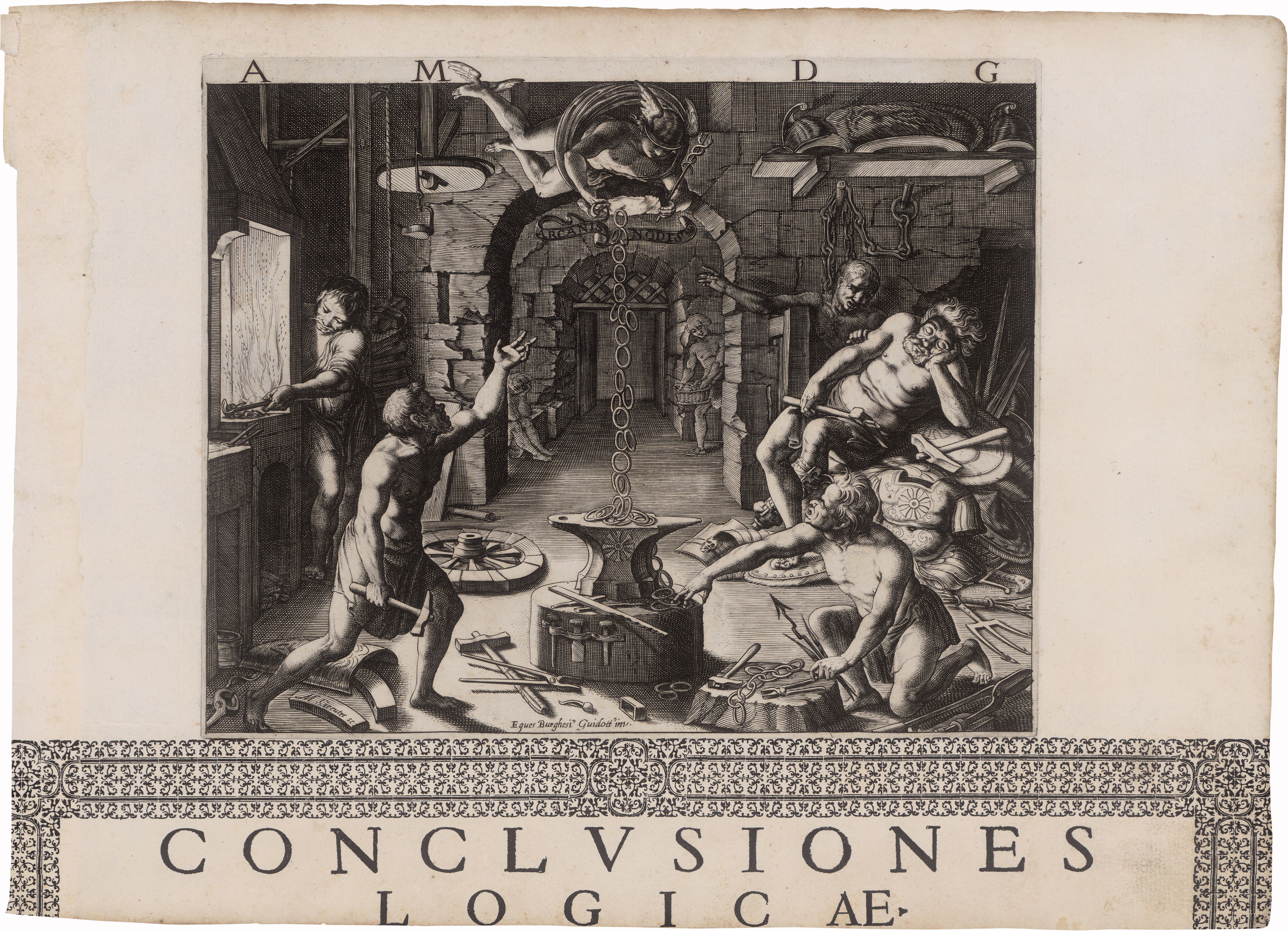 Thesenblatt mit der separaten Schrift. Laut Hollstein wohl von der Hand eines Künstlers aus der Werkstatt Greuters. Prachtvoller, kontrastreicher Druck. Leichte Gebrauchsspuren, sonst gutes Exemplar. Selten, Hollstein erwähnt 6 Exemplare in London, Paris, Rom, Wien und Wolfegg. Bei der Mehrzahl dieser Abzüge fehlt die Schrift in Blocksatz.