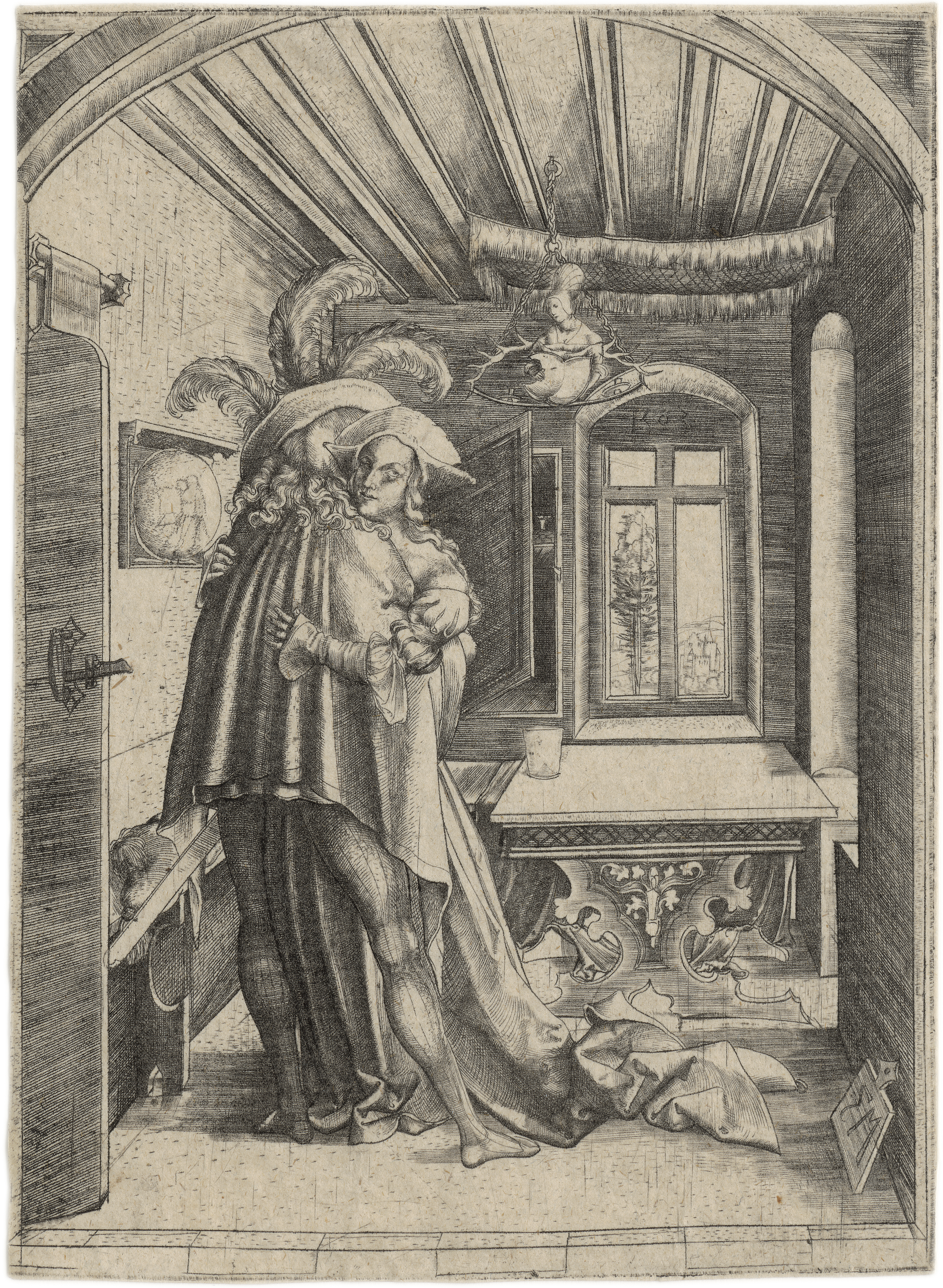 Dieser Kupferstich des Meisters MZ alias Matthäus Zasinger ist Lehrs zufolge "unstrittig die reifste und schönste seiner Arbeiten. Keine andere kommt ihr an liebevoller Durchführung, an Tiefe der Empfindung und an Stimmungsgehalt gleich." Er beschreibt die Komposition wie folgt: "In diesem jungen Paar, das sich eng umschlungen hält und dessen Bild ein an der Wand hängender Rundspiegel diskret wiedergibt, ist samt der liebevoll in allen Einzelheiten geschilderten Darstellung des kleinen getäfelten Zimmers, dem gotischen Tisch, dem Fenstersitz, dem Lüsterweibchen, dem Wandschränkchen, der Handtuchrolle, der offenen Türe, durch die der Liebste eben eingetreten ist, ein Sinnbild der gemütvollen deutschen Kunst des beginnenden XVI. Jahrhunderts, wie sie uns zuerst aus Dürers Traum und seinem heiligen Hieronymus im Gehäus ... entgegenstrahlt" (S. 337).- Ganz ausgezeichneter Druck mit feinen Wischkritzeln, knapp bis an die Plattenkante geschnitten, oben mit feinem Rändchen sowie rechts und unten Spuren eines Rändchens. Leicht angestaubt, minimal fleckig, verso kleine Leimrestchen sowie links entlang des Randes feinem Papierstreifen, sonst in vorzüglicher Erhaltung.
