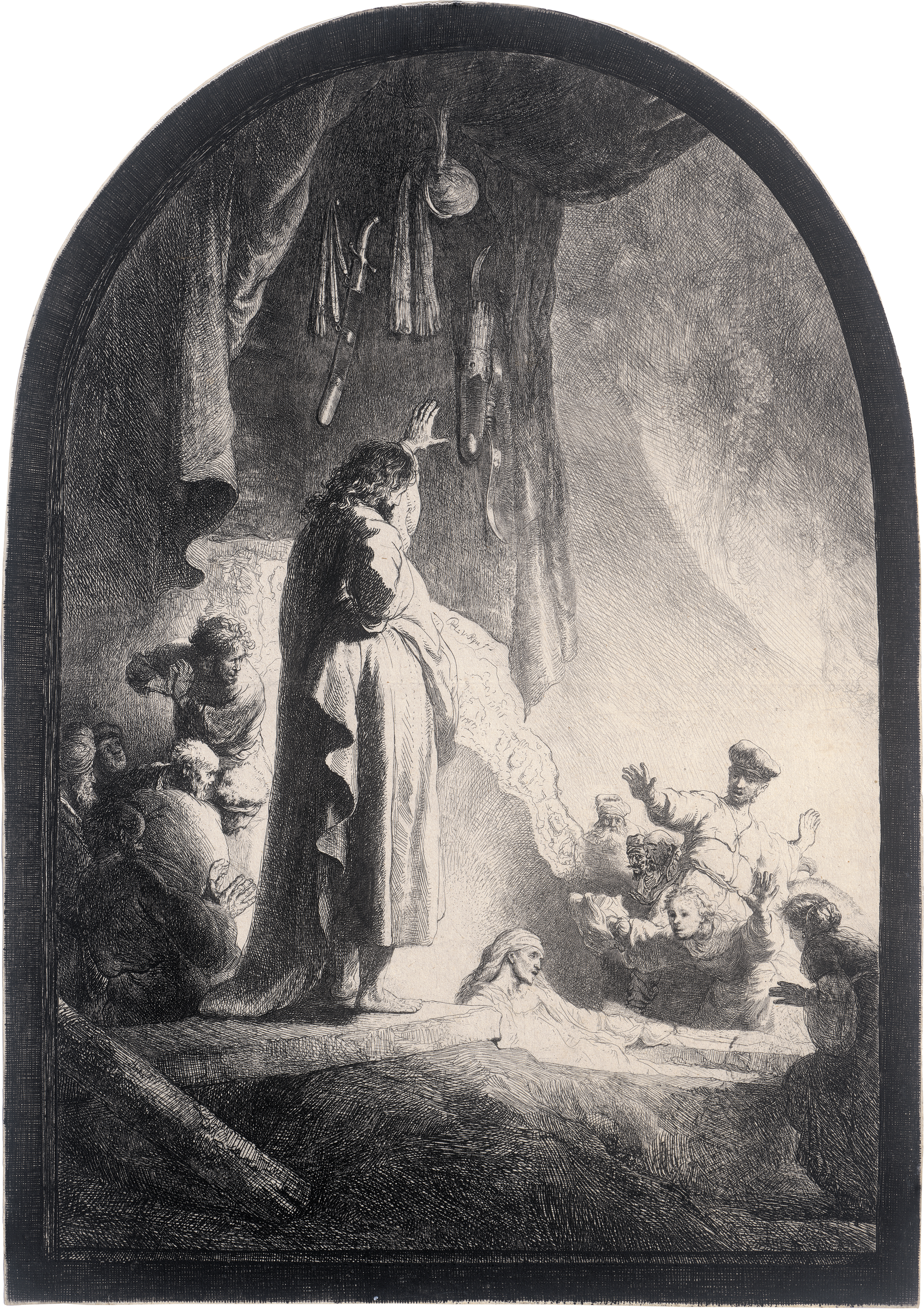 Mit der Überarbeitung des Beines des entsetzten Mannes rechts, der Mann im Hintergrund trägt einen Turban. Prachtvoller, ungewöhnlich kräftiger, in allen Partien klarer und stofflicher Druck, auf die Plattenkante beschnitten. Mit deutlichem Grat auf den Gesichtern der beiden Alten und der erstaunten Frau mit ausgebreiteten Armen. Der Abzug überzeugt neben seiner drucktechnischen Präzision besonders durch den fein abgestimmten Reichtum an Hell-Dunkel-Gegensätzen, so sind z.B. die Partien zwischen den Füßen von Christus und Lazarus bzw. zwischen der Menschengruppe links und Christus' Rückenkontur vollkommen rein gewischt und kommen leuchtend zur Geltung. Der Übergang zu den dunkleren Stellen wird durch einen überaus vorsichtigen, doch wirkungsvollen, Einsatz von Plattenton erreicht. Ein graphisches Hauptwerk des jungen Rembrandt in einem zeitgenössischen Abzug, wie er nur selten auf dem Auktionsmarkt zu finden ist. Leichte geglättete Mittelfalte sowie eine zarte horizontale Quetschfalte vom Druck, recto nicht sichtbare geglättete Diagonalfalte, je ein winziger geschlossener Einriss im oberen und unteren Rand, Klebereste verso, kleine Ausbesserungen in den unteren Ecken, sonst jedoch vorzügliches Exemplar und überzeugend in der Ausstrahlung. Aus der Sammlung Pierre Mariette, 1674 (Lugt 1790).