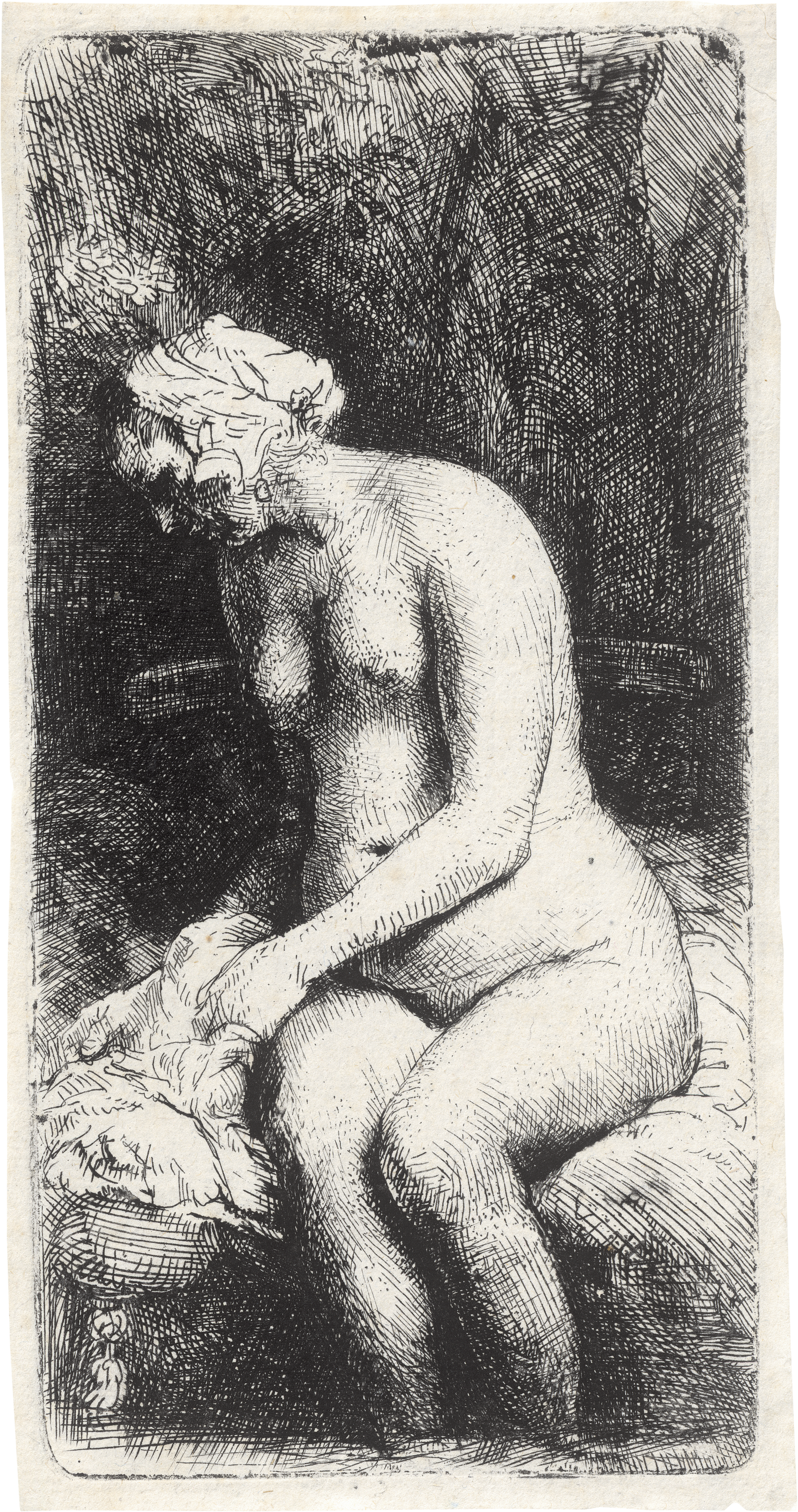 Nackte Frau im Freien, mit den Füßen im Wasser. Radierung. 16 x 8 cm. (1658). B. 200, White/Boon (Hollstein) 200, Nowell-Usticke 200 I (von II), Hinterding/Rutgers (New Hollstein) 309 I (von II).