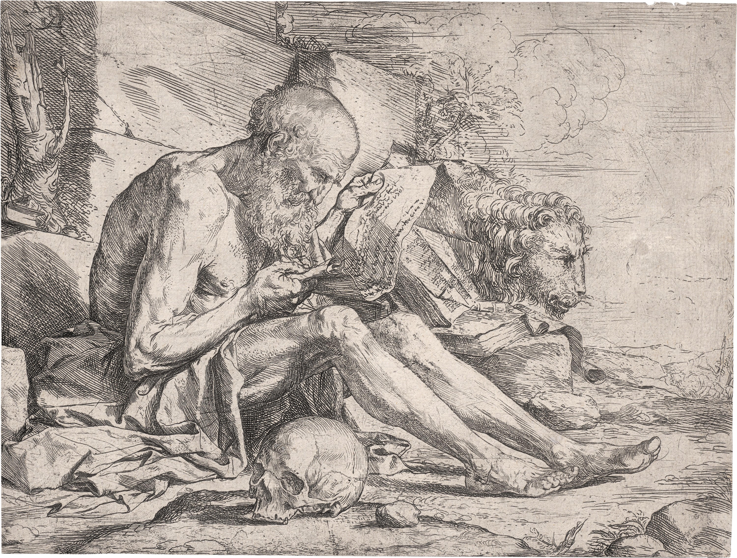 Der hl. Hieronymus, lesend. Radierung. 18,9 x 24,9 cm. (1624). B. 3, Brown 13. Wz. Bekröntes Lilienwappen.