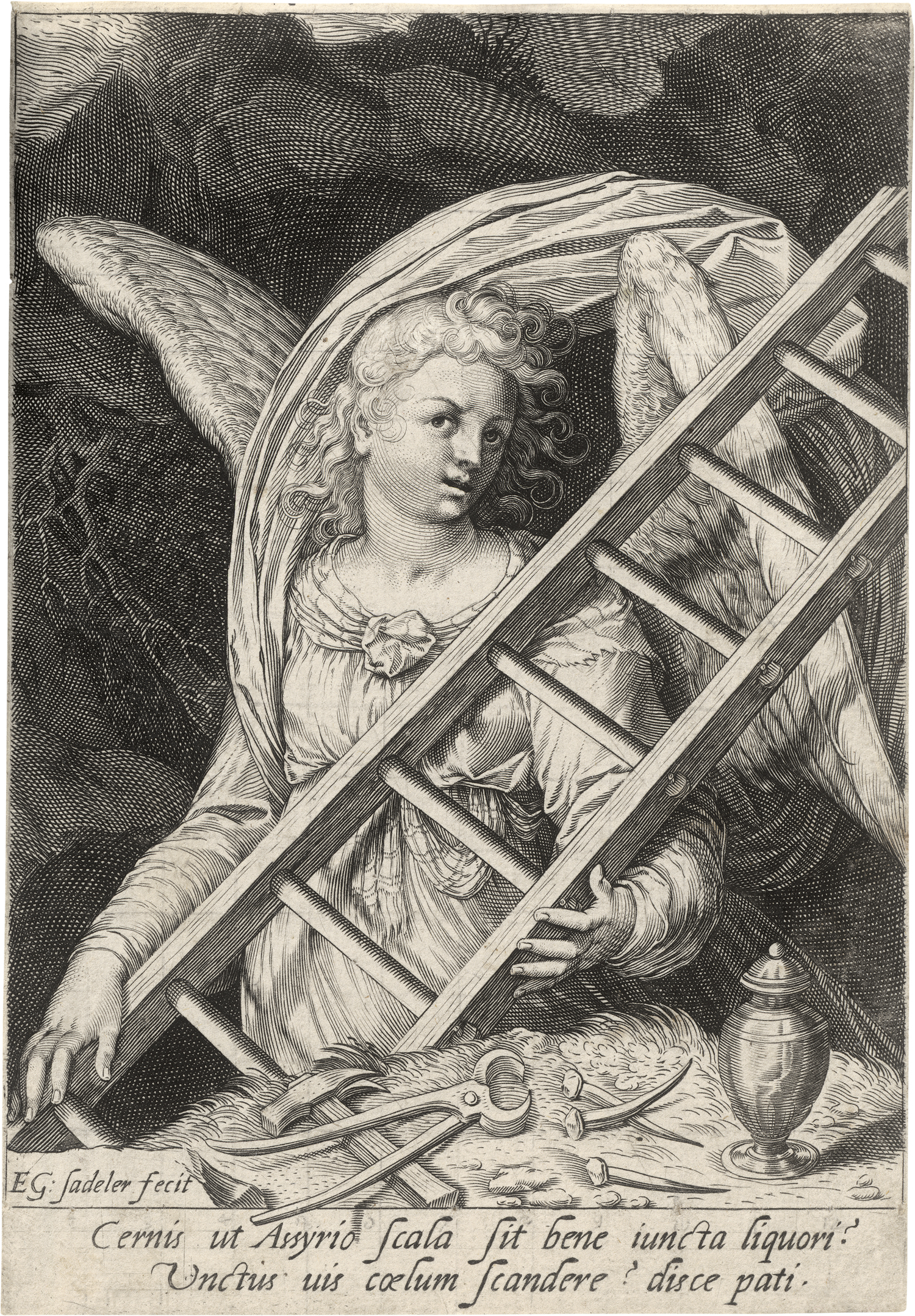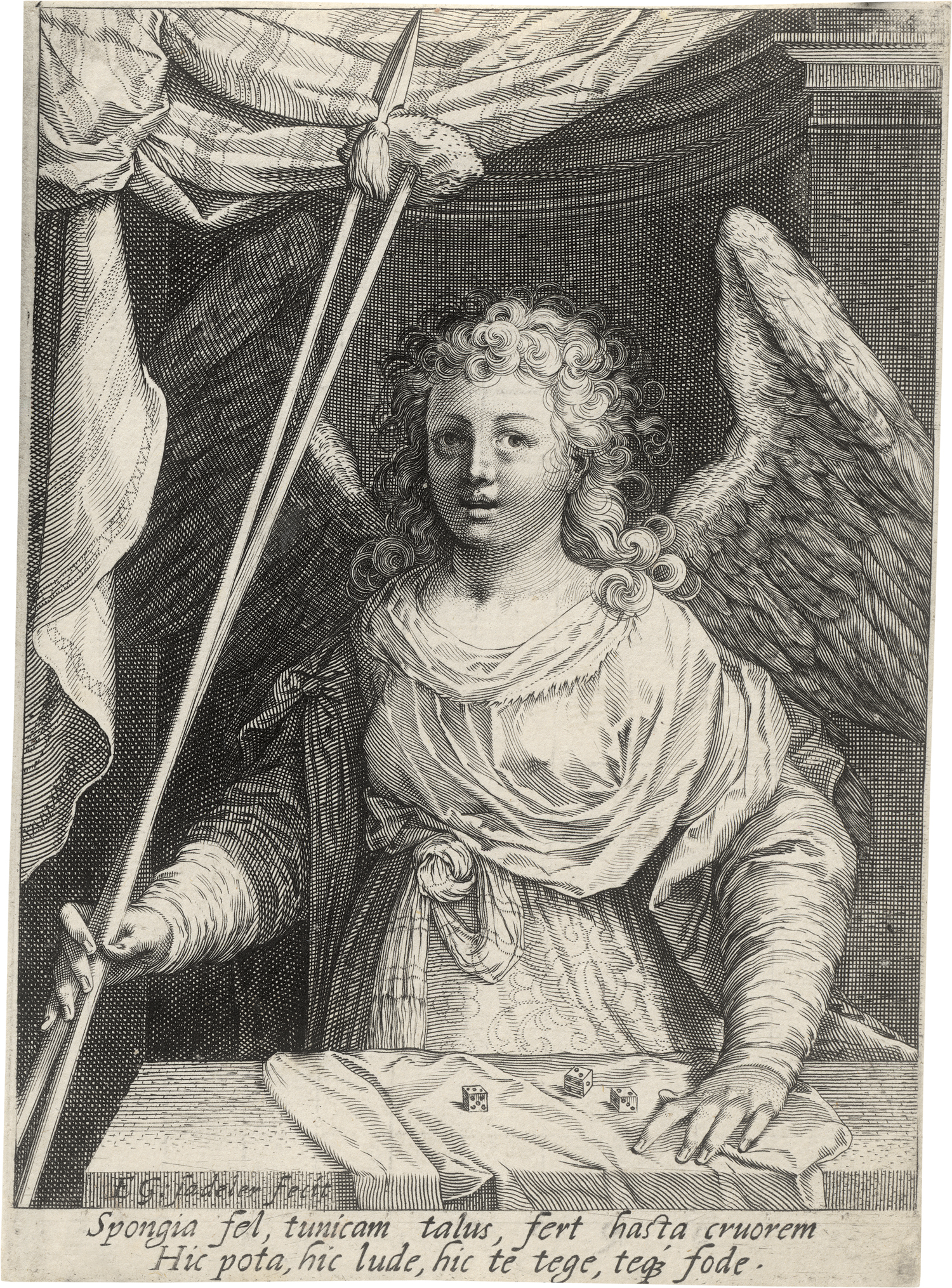 Die bis auf das Titelblatt mit dem Schmerzensmann und Hollstein 66 komplette Folge der Engel mit den Marterwerkzeugen. Ganz ausgezeichnete, markante Drucke mit zartem Plattenton und sehr feinem Rändchen um die Einfassung, unten mit der Schrift, teils bis an diese beschnitten. Schwache Alters- und Gebrauchsspuren, vier Blatt mit Spuren einer Bleistiftquadrierung, H. 65 mit winziger Randläsur unten, H. 68 mit dünnen Stellen, sonst schöne, einheitliche Exemplare. Beigegeben eine sehr versierte Kopie des fehlenden Blattes H. 66.