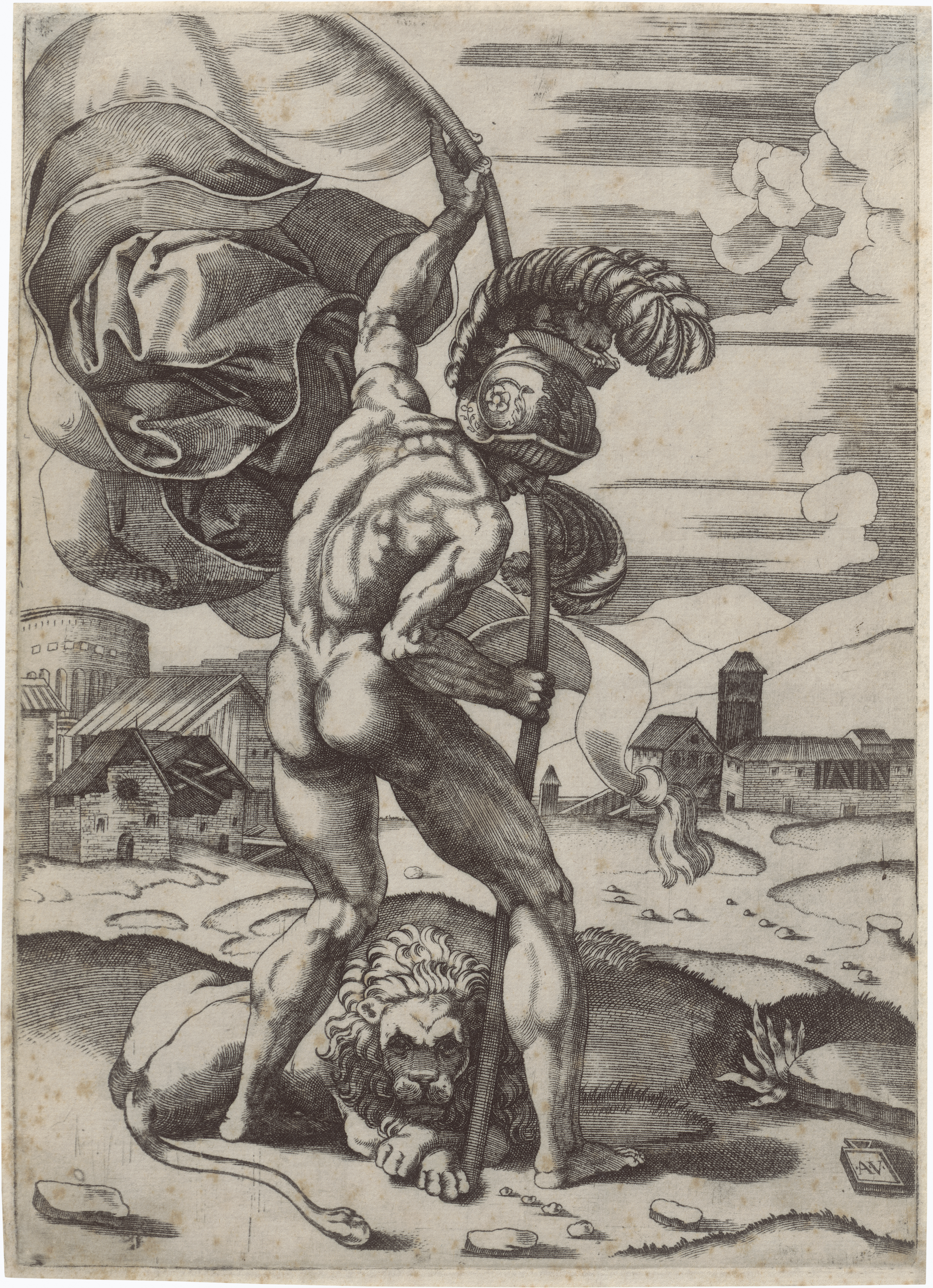 Mann mit Fahne und Löwe. Radierung nach Marcantonio Raimondi. 24,9 x 17,9 cm. B. XIV, S. 357, 482. Wz. undeutlich.