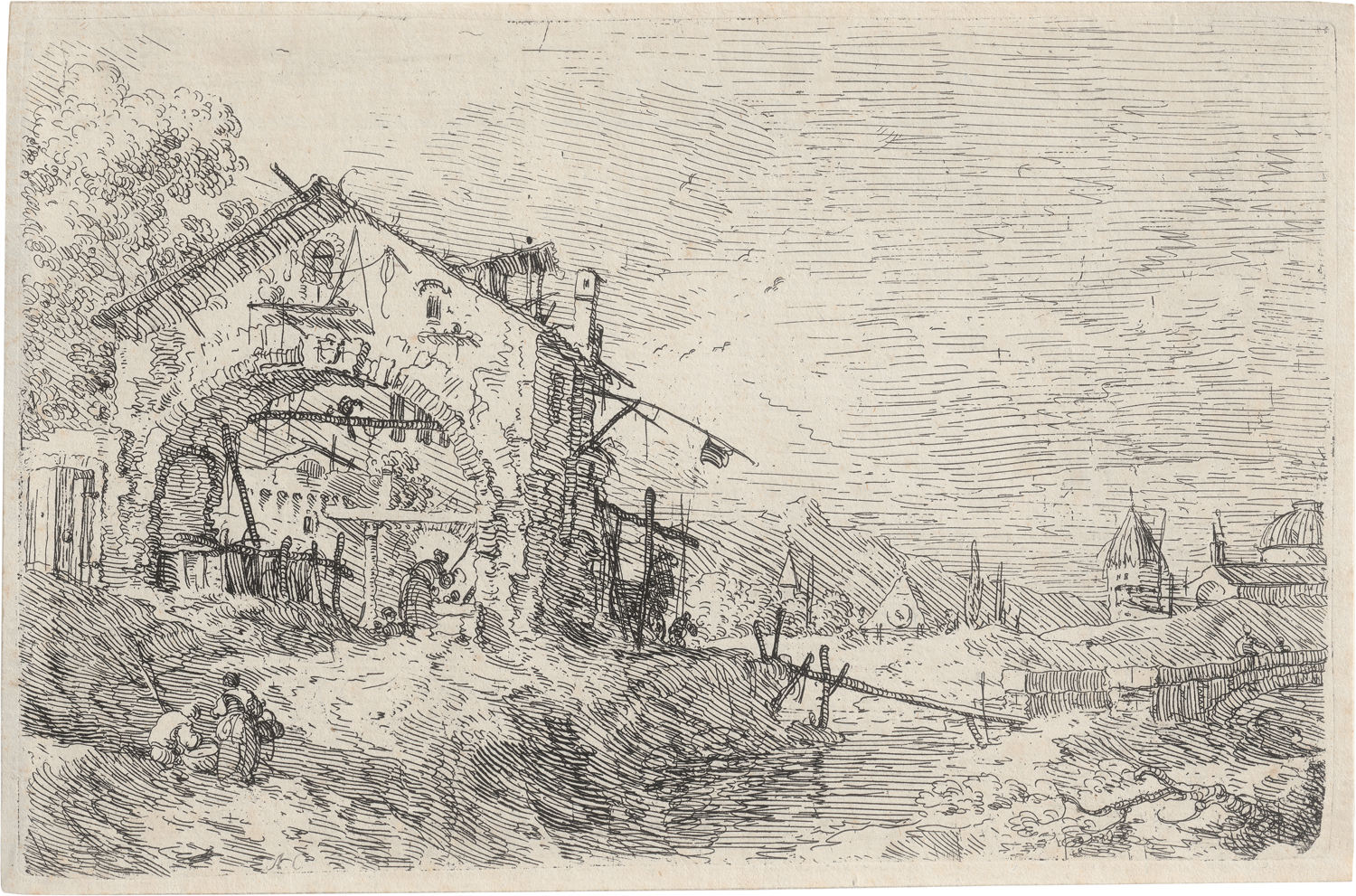 Mit den zwei Pfählen, aber vor dem Glitscher unterhalb der Mauer. Von dem Etat vor den zwei Pfosten ist nur ein Abzug in Windsor bekannt. Prachtvoller, transparenter Druck aus der 1. Auflage von Pasquali mit feinem, bis 4 mm breitem Rändchen. Sehr blasse Stockflecken, Montierungsspuren verso an einer Kante, sonst in sehr schöner, harmonischer Erhaltung.