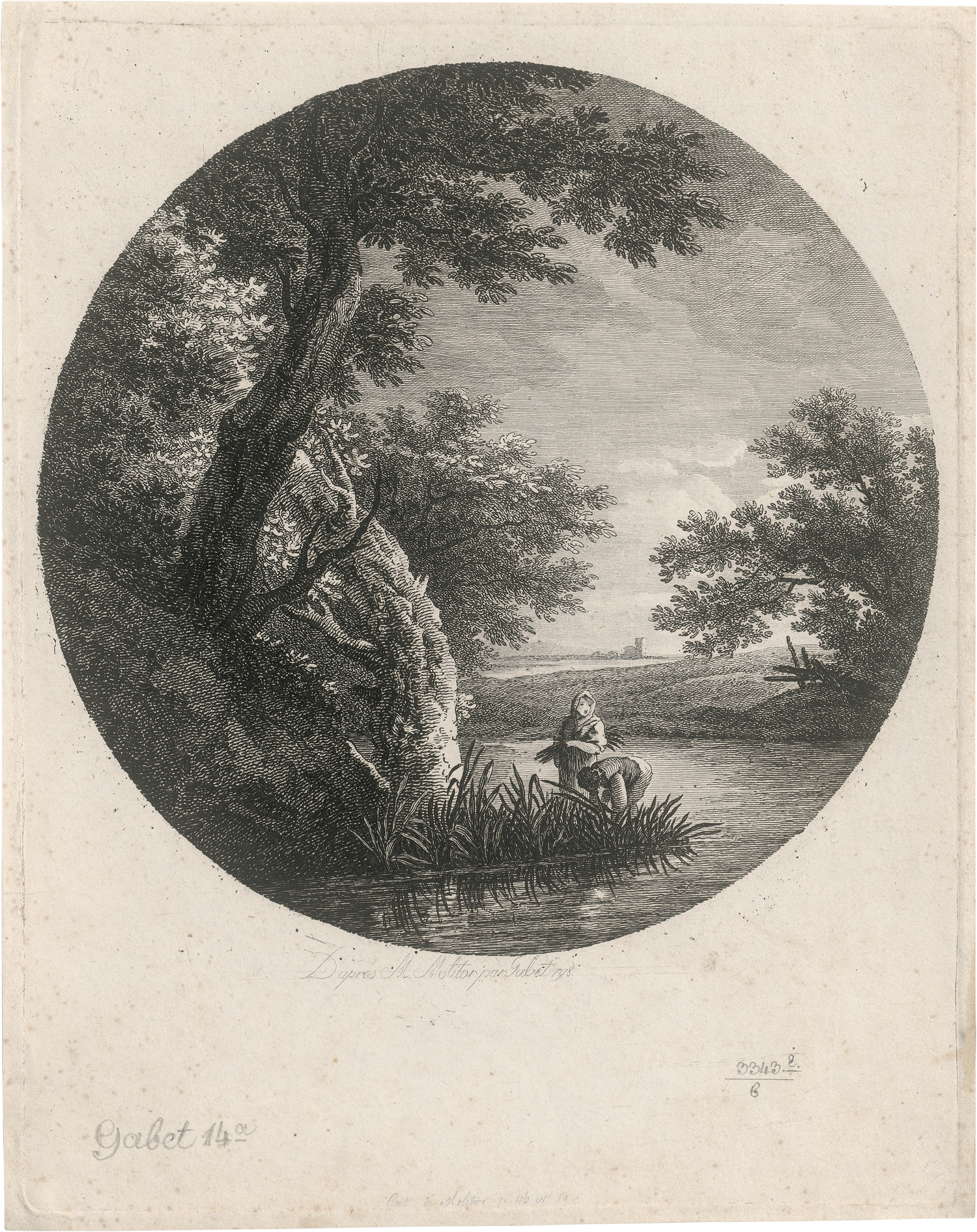 Der Wiener Sammler und dilettierende Künstler Franz Gabet schuf an die einhundert Landschaftsradierungen, deren subtile Technik nur selten den "Dilettanten" verrät. Seine besten Arbeiten entstanden in der Zeitspanne zwischen 1790-1810, darunter eine größere Gruppe von Radierungen nach Martin von Molitor, mit dem Gabet freundschaftlich eng verbunden war und dessen Werke er sammelte. Zu den Blättern nach dem Künstlerfreund Molitor zählen Landschaftsradierungen in runder Form - Nagler erwähnt neun runde Landschaften, Andresen eine sechsblättrige Folge. Die beiden vorliegenden Blätter mit der einheitlichen Beschriftung "D'aprés M. Molitor par Gabet 798" weisen ein größeres Format auf als die anderen Landschaftstondi Gabets und entstanden offensichtlich als Pendants (vgl. Albertina, Klebebände, Nr. D/III/45/39 und D/III/45/40). Der kompositorisch gespiegelte Bildaufbau verschränkt die beiden Teile eines einheitlichen, mittig geteilten Landschaftsmotivs. - Prachtvolle Drucke mit schmalen Rändern um die Plattenkanten, leicht stockfleckig, an den linken Ecken verso Reste alter Montierung, sonst sehr schön erhalten. Aus der Sammlung Johann Nepumuk Seiler, München (Lugt 3976). Selten.