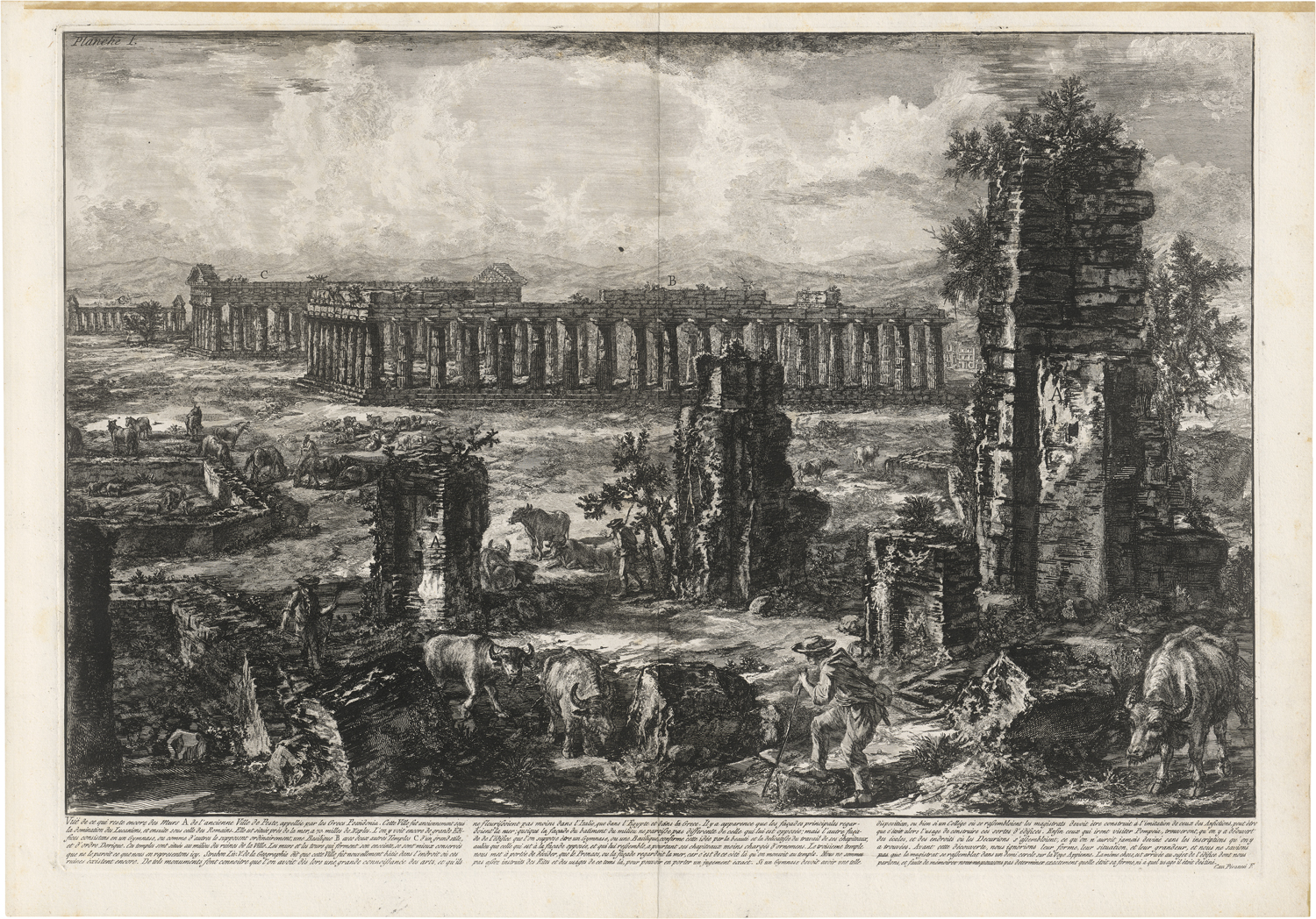 Différents vues de quelques Restes de trois grands Edifices qui subsistent encore dans le milieu de l'ancienne Ville de Pesto autrement Posidonia qui est située dans la Lucanie. 21 Radierungen inkl. Titel, lose Blatt. Je ca. 51 x 70 cm. (1778). Focillon 583-599, Wilton-Ely 717-737. Wz. Fleurs-de-lis im Doppelkreis.
