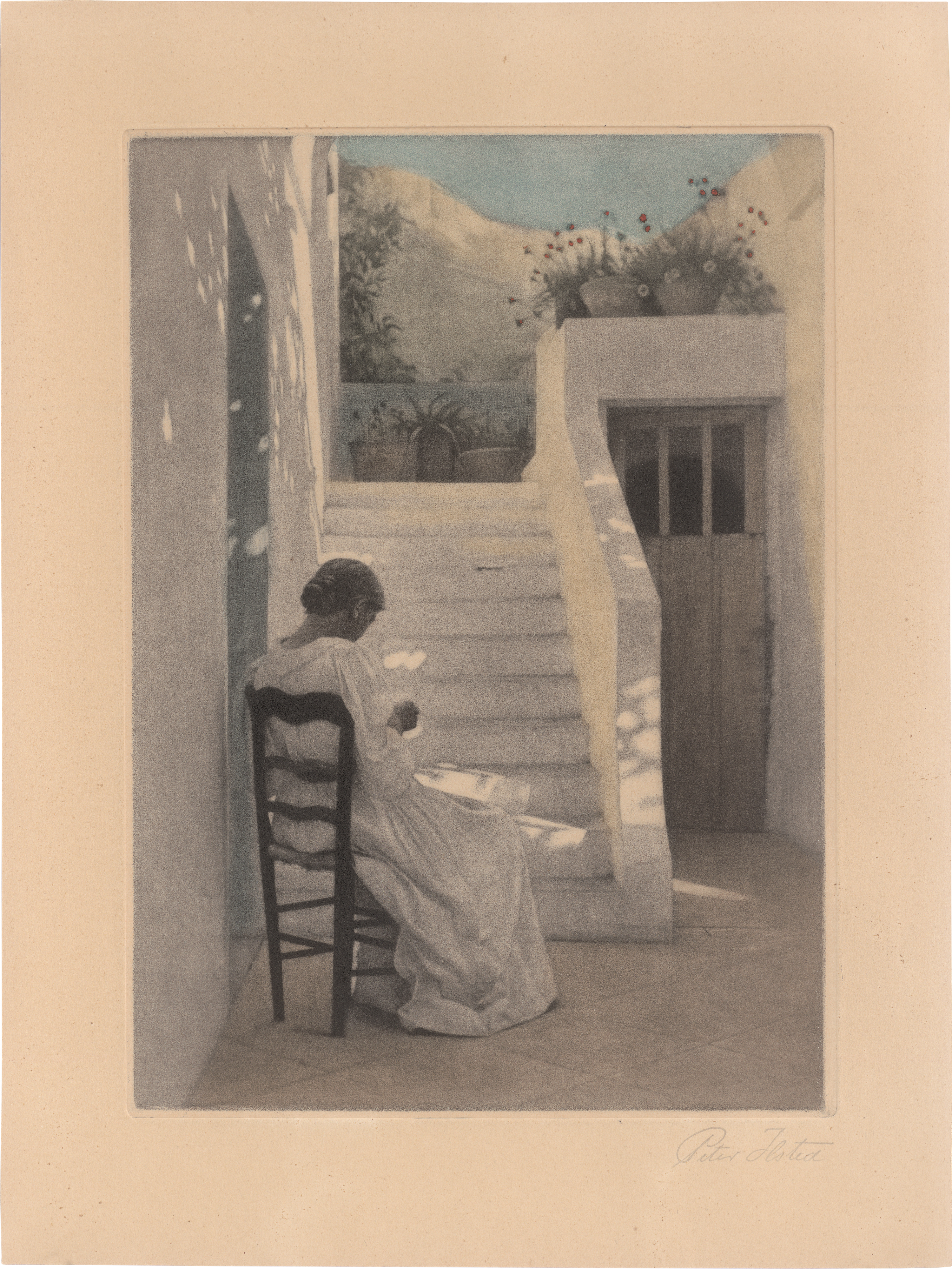Nähendes Mädchen im Schatten einer italienischen Villa. Farbiges Schabkunstblatt, die Blüten rot gehöht. 26,2 x 18,8 cm. Mit der Stempelsignatur. Um 1928. Nicht bei Olufsen-Svensson.
