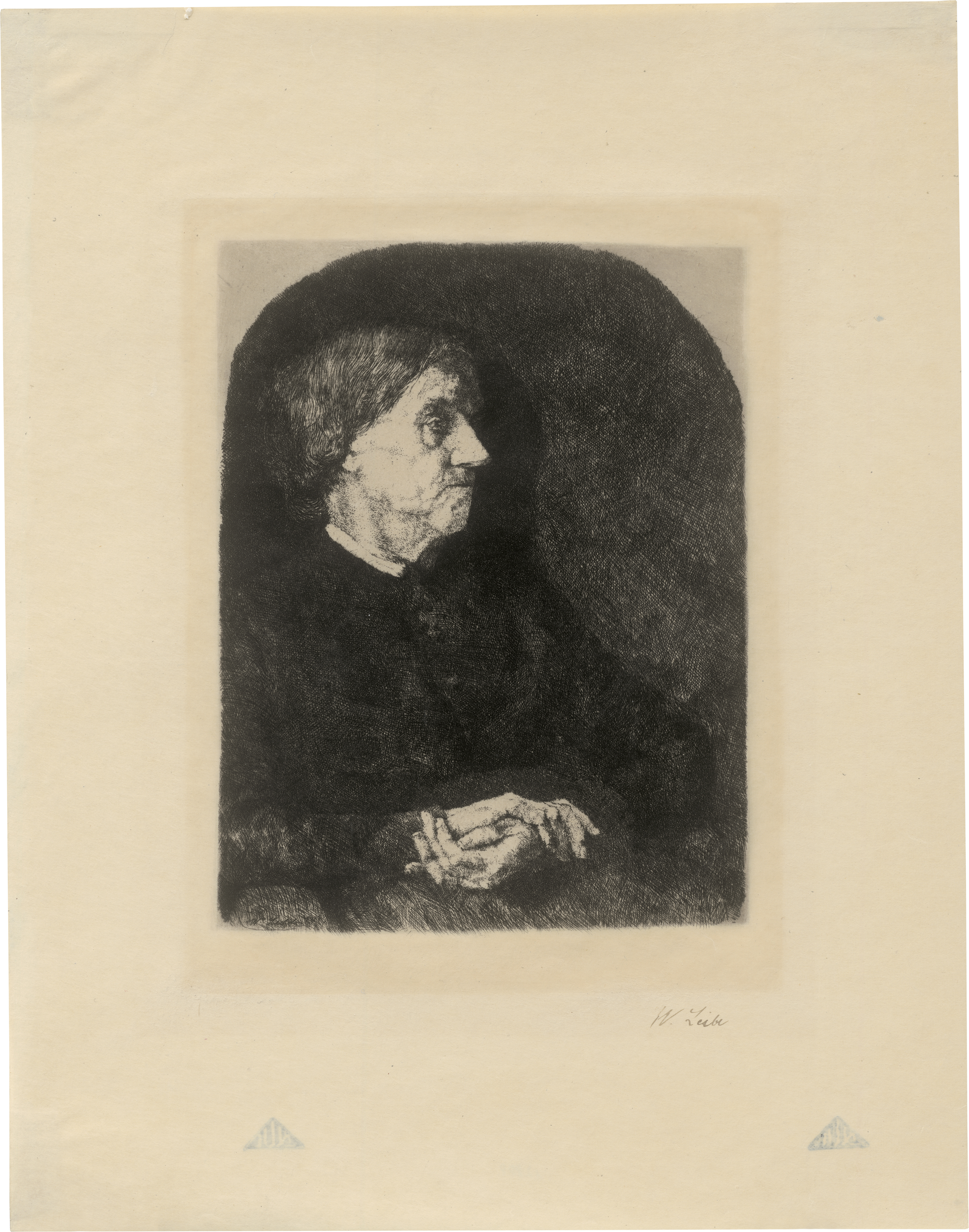 Leibls Mutter. Radierung auf Similijapan. 20,8 x 15,6 cm. (18)74. Unten rechts in brauner Feder signiert "W. Leibl". Gronau 5, Billeter 5 II (von III).