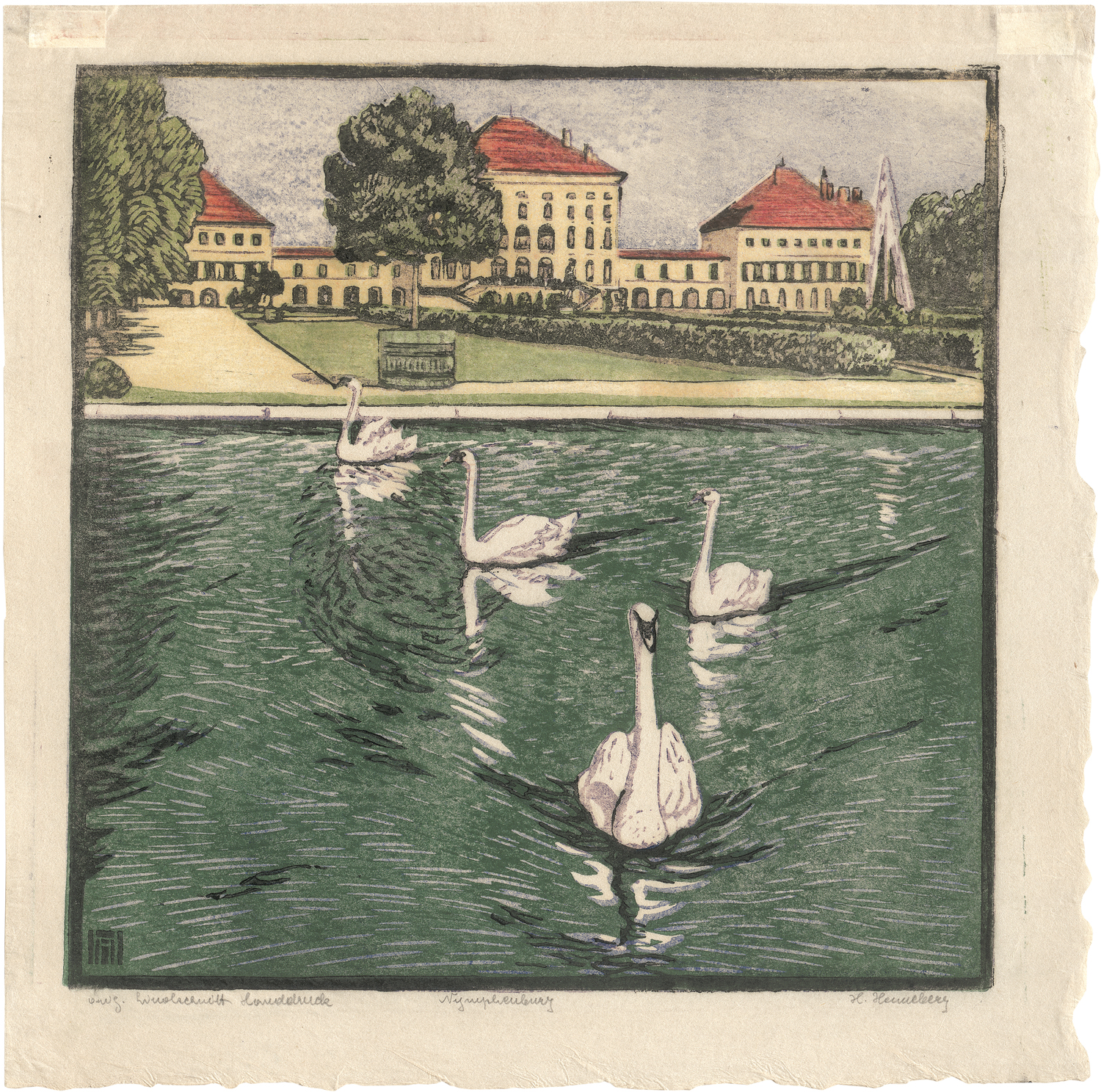 Nymphenburg. Farblinolschnitt auf Similijapan. 30 x 30,3 cm. Signiert und eigenh. betitelt "Nymphenburg" sowie eigenh. bez. "orig. Linolschnitt Handdruck". Um 1903.