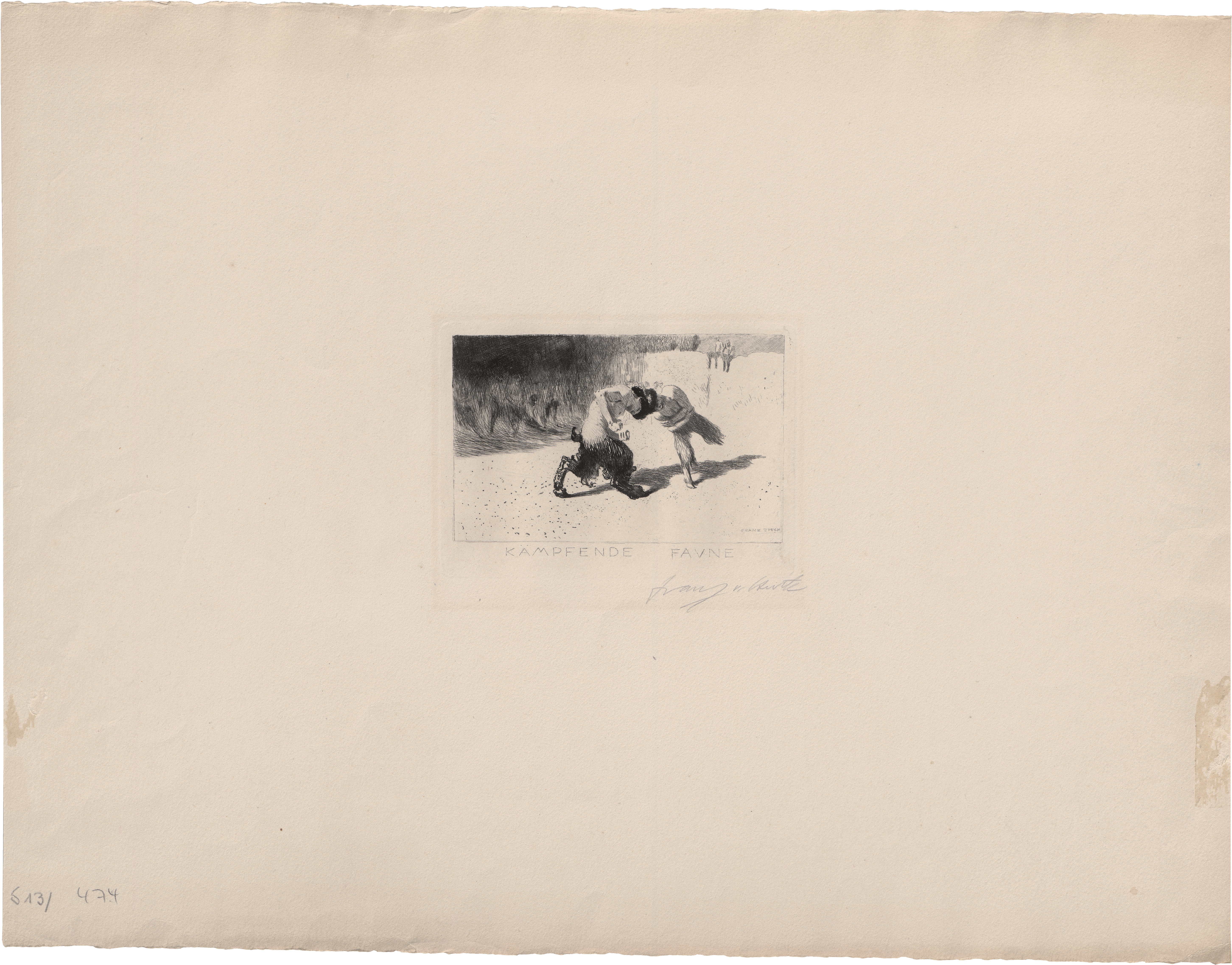 Kämpfende Faune. Radierung auf festem Velin. 10,3 x 14,2 cm. Signiert "Franz v. Stuck".