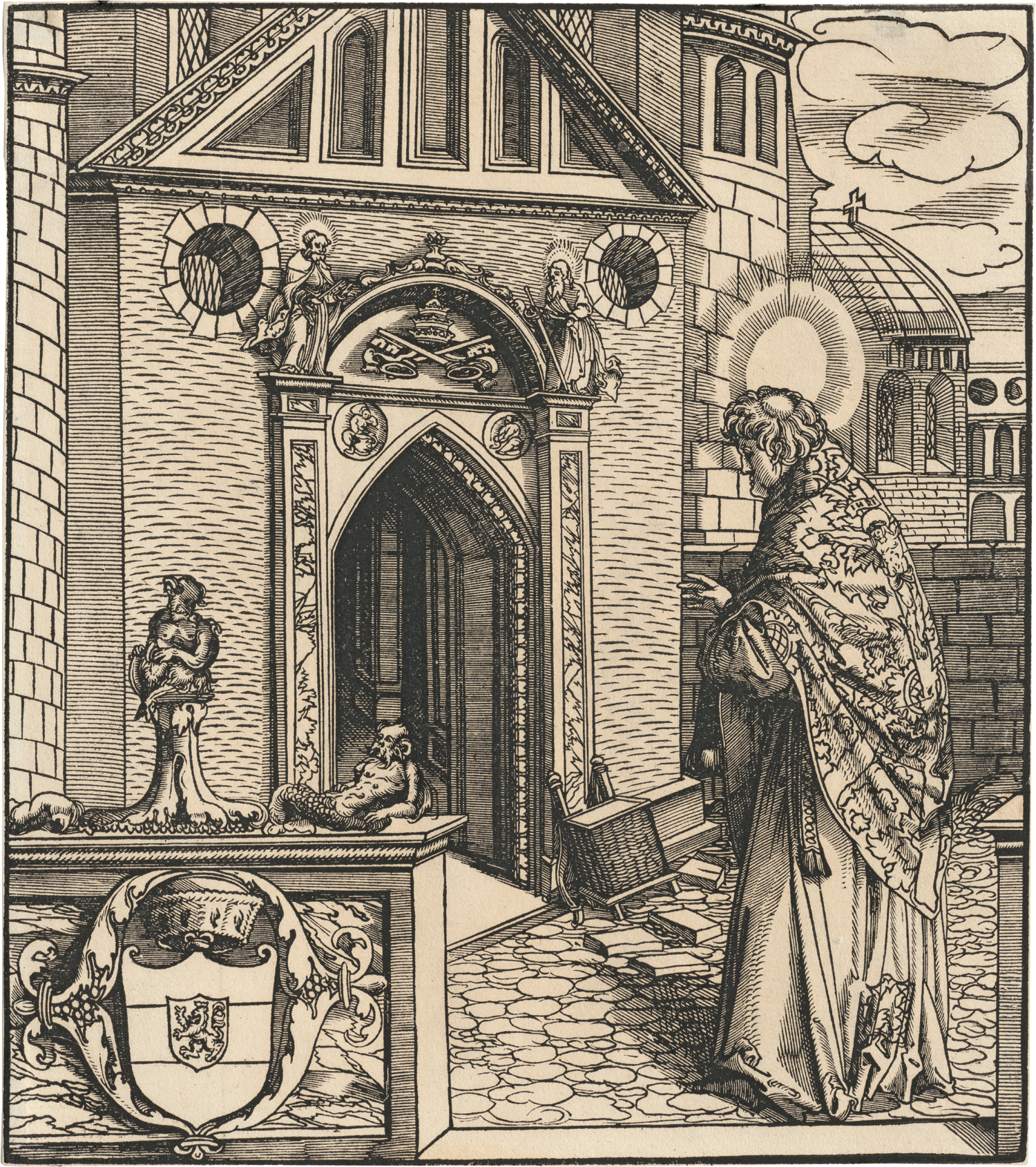 Die fünf präzise geschnittenen und von Bartsch ehemals Hans Burgkmaier zugeschrieben Blätter zählen zu der insgesamt 123 Darstellungen umfassenden Folge "Die Heiligen aus der 'Sipp-, Mag- und Schwägerschaft' des Kaisers Maximilian I.", die von verschiedenen Holzschneidern aus der Werkstatt Jost de Negkers zwischen 1516 und 1518 in Augsburg ausgeführt wurde. Unsere Exemplare stammen wohl aus der späten vierten Auflage, die von S. Laschnitzer zwischen 1886-1887 herausgegeben wurde. Ganz ausgezeichnete, klare und kräftige Drucke verso teils mit schönem Druckrelief, mit feinem Rändchen, H. 10 mit schmalem Rand um die Einfassung. Minimal angestaubt, vereinzelt etwas fleckig, sonst sehr schön erhalten. Allesamt aus der Sammlung des Kunsthändlers Franz Meyer, Dresden (verso mit dessen handschriftl. Vermerk) sowie der Sammlung Erhard Kaps (Lugt 3549), H. 63 aus der Sammlung Friedrich II. August von Sachsen (Lugt 971), H. 10, 63 aus der Sammlung Scharfen (Lugt 3951), H. 46, 101 aus der Sammlung Sibyll Kaps (Lugt 3574), H. 73 aus der Sammlung Ines Kamps (Lugt 3551). Beigegeben 18 weitere Holzschnitte süddeutscher Meister, u.a. von Leonhard Beck (Hollstein 146, 223, 249), Hans Burgkmair (Hollstein 453, 460) sowie von Jost Amman, Hans Sebald Beham, Hans Brosamer, Lucas Cranach d.Ä. Insgesamt 23 Blatt.