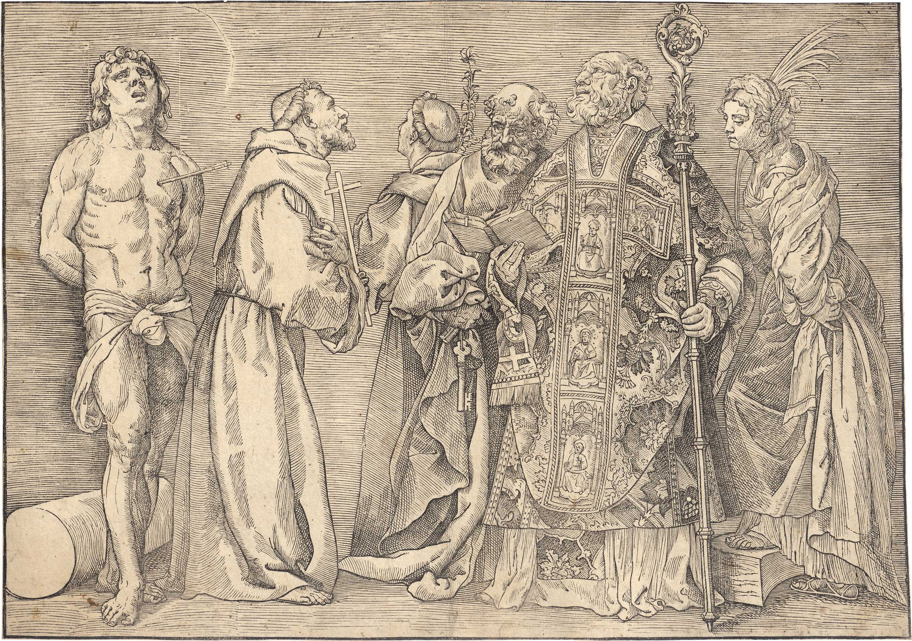 Die sechs Heiligen: Sebastian, Franziskus, Antonius, Petrus, Nikolaus und Katharina von Siena. Holzschnitt nach Tizian. 37,4 x 53,6 cm. Mauroner, Le incisione di Tiziano, 8-I, Dreyer 9-I b, Muraro/Rosand 44. Wz. Anker im Kreis mit sechszackigem Stern.