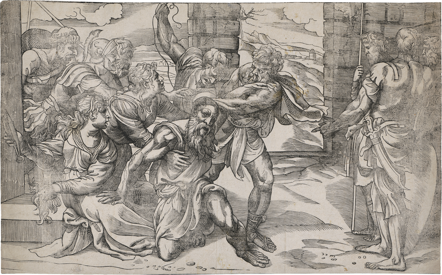 Samson und Delilah (Samsons Gefangennahme). Holzschnitt nach Tizian. 30,2 x 49 cm. Passavant VI, S. 223, 5, Dreyer 10, Muraro/Rosand 48. Wz. Bekröntes Bandenwappen.