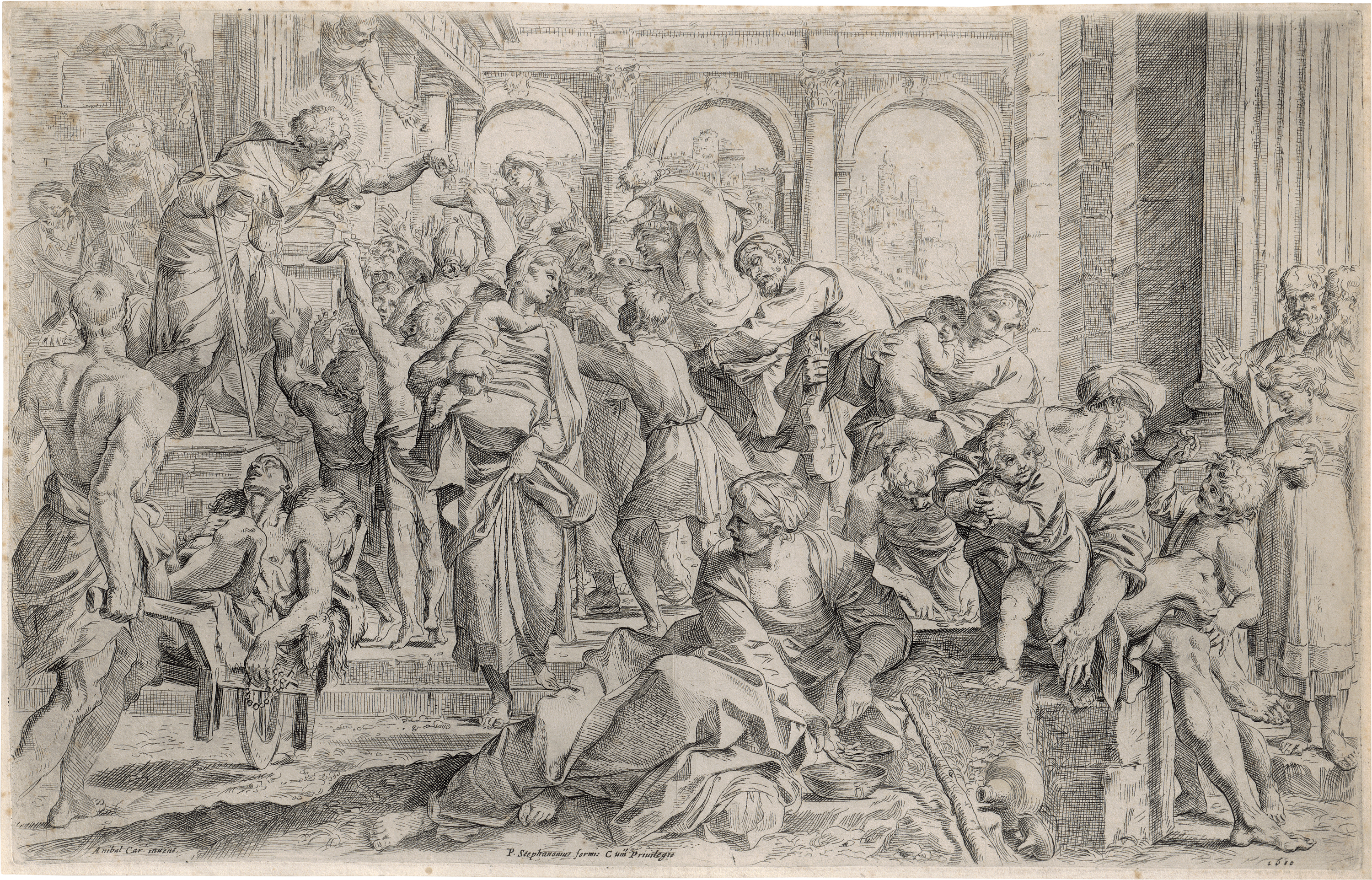 Der hl. Rochus verteilt seine Habe an die Armen. Radierung nach Annibale Carracci. 28,7 x 45,1 cm. 1610. B. XVIII (Reni), S. 305, 53 II, TIB (Brizio) .049 S3. Wz. Monogramm im Oval mit Stern darüber.