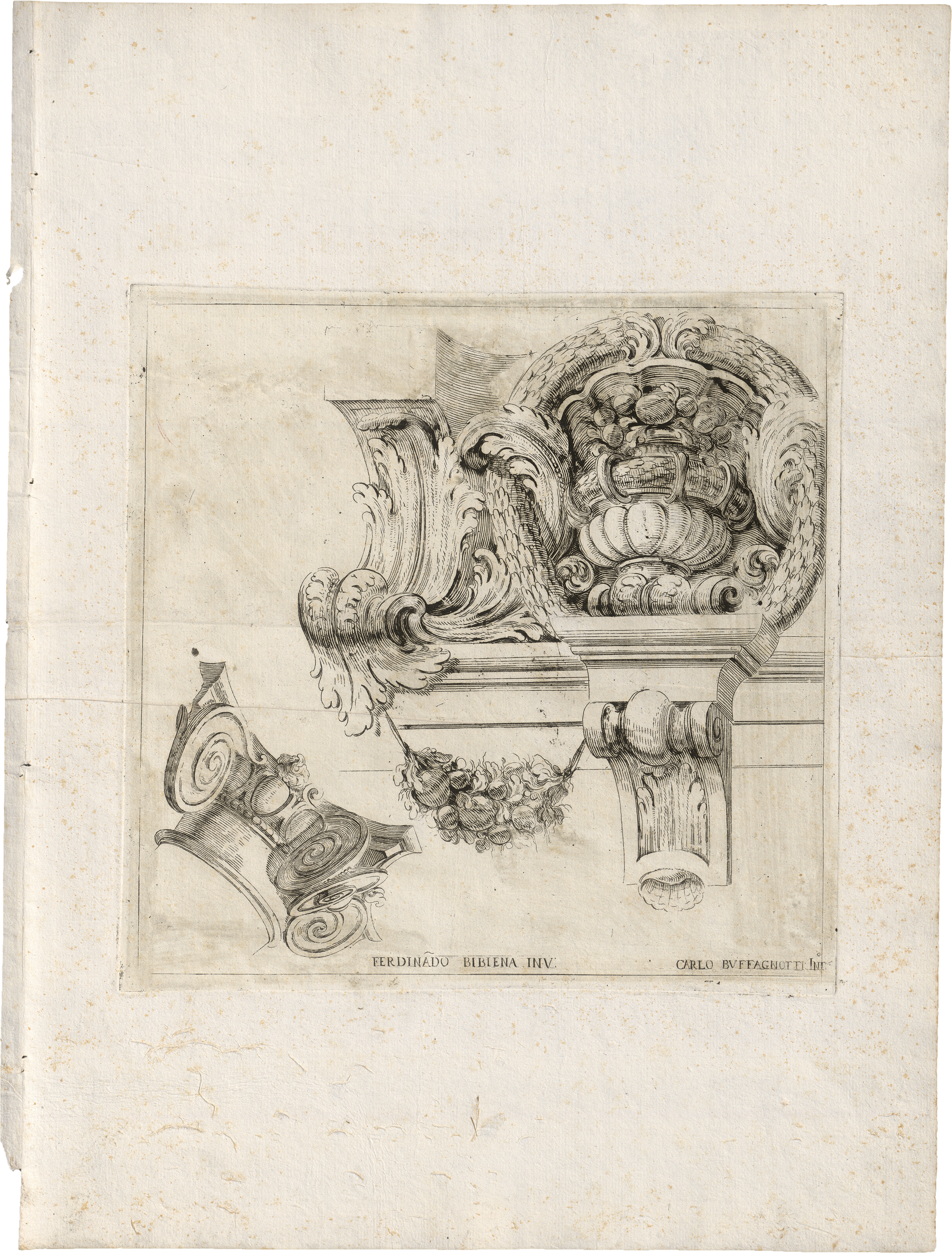 Entwürfe für Theaterdekorationen mit einzelnen Darstellungen architektonischer Elemente vor weißem Grund: ein korinthisches Kapitell und ein Fragment eines Gesimses mit Akanthusranken; Kartusche, Blattwerk und Details von Gesimsen mit stilisiertem Blattwerk; sowie das Kapitell einer Säule unten links, die Ecke eines Frieses (?) mit einem Akanthusblatt und eine Konsole mit einer Vase aus Blattwerk und Obst. Prachtvolle, kräftige Drucke mit zarten Wischspuren und mit breitem Rand, teils wohl dem vollen Rand. Links alte Heftspuren, leicht stockfleckig, weitere Alters- und Handhabungsspuren, sonst jedoch einheitlich und gut erhalten.