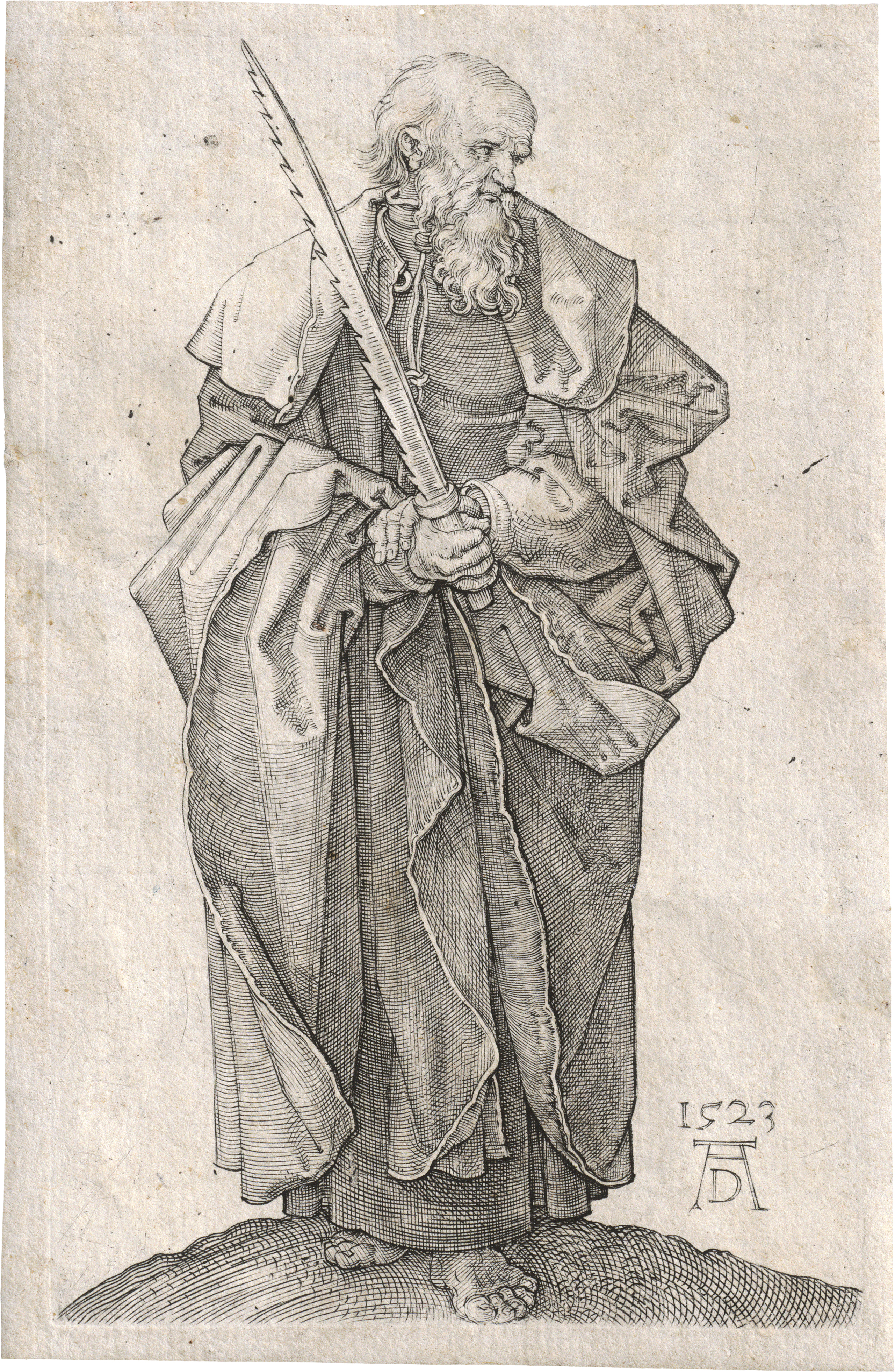 Der Apostel Simon. Kupferstich. 11,7 x 7,4 cm. 1523. B. 49, Meder 49 c-d (von d). Wz. Anker oder Waage im Kreis mit angehängtem Stern (Fragment, vgl. Meder 171 oder 170).