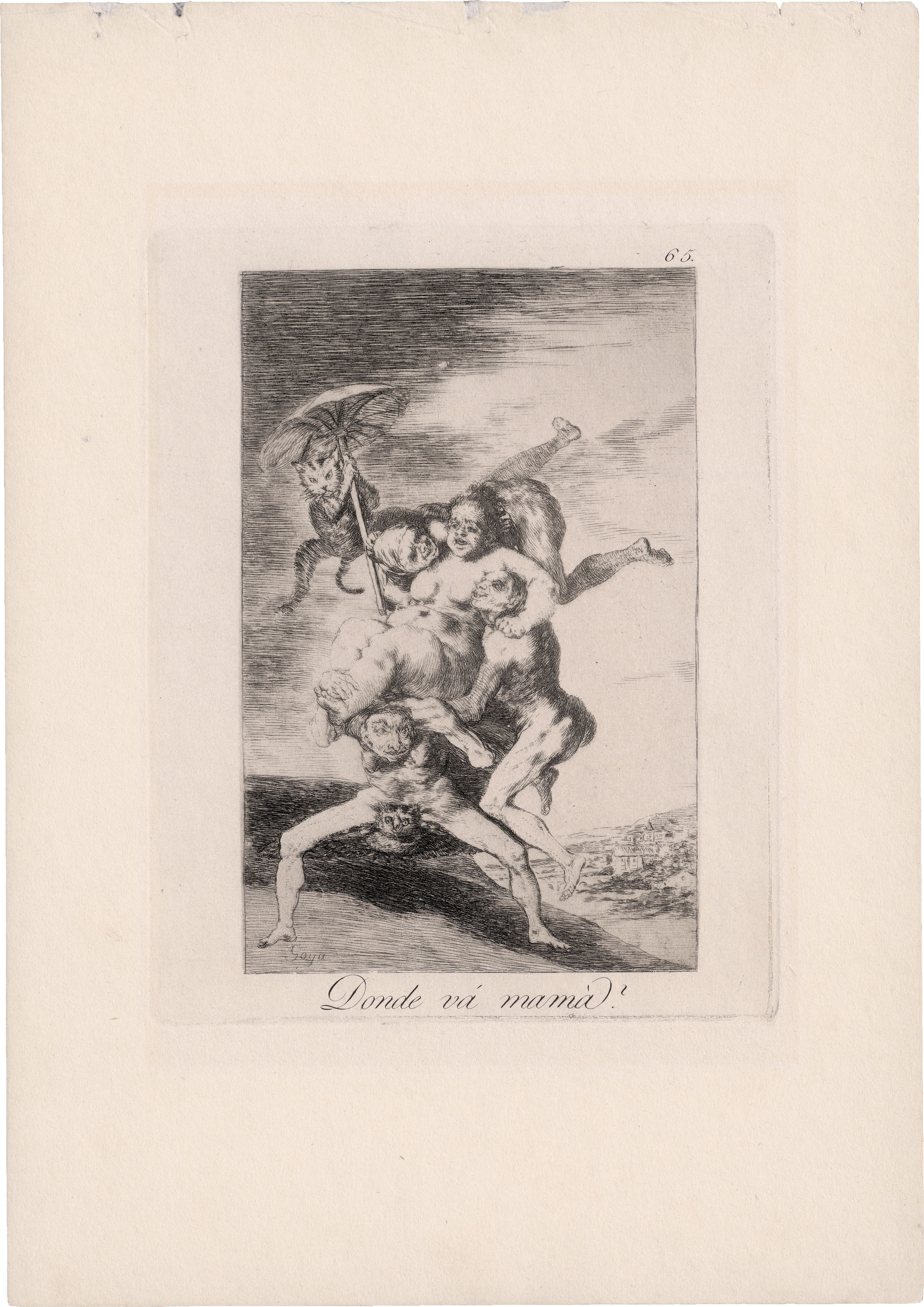 Bien tirada està; Donde vá mamá? 2 Radierungen mit Aquatinta auf Velin, aus der Folge Los Caprichos, wie auch die folgenden fünf Losnummern. Je ca. 21,6 x 15 cm (Plattenrand); 34,1 x 23,4 cm (Blattgröße). Harris 52 und 100, jeweils III, 5.-9. Auflage (von 12).