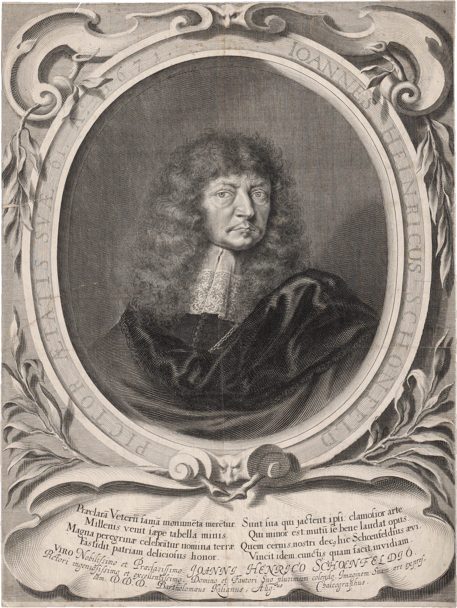 Der Künstler Johann Heinrich Schönfeld soll von Geburt an auf dem linken Auge blind gewesen sein, weshalb das vorliegende Blatt ihn mit getrübtem Auge zeigt. Ganz ausgezeichneter Druck an bzw. auf die Einfassungslinie geschnitten, unten mit feinem Rändchen. Etwas angestaubt sowie fleckig, horizontale und vertikale Falzspuren, links zwei hinterlegte Randeinrisse, Alters- und Gebrauchsspuren, verso Montierungsreste, sonst noch gut.