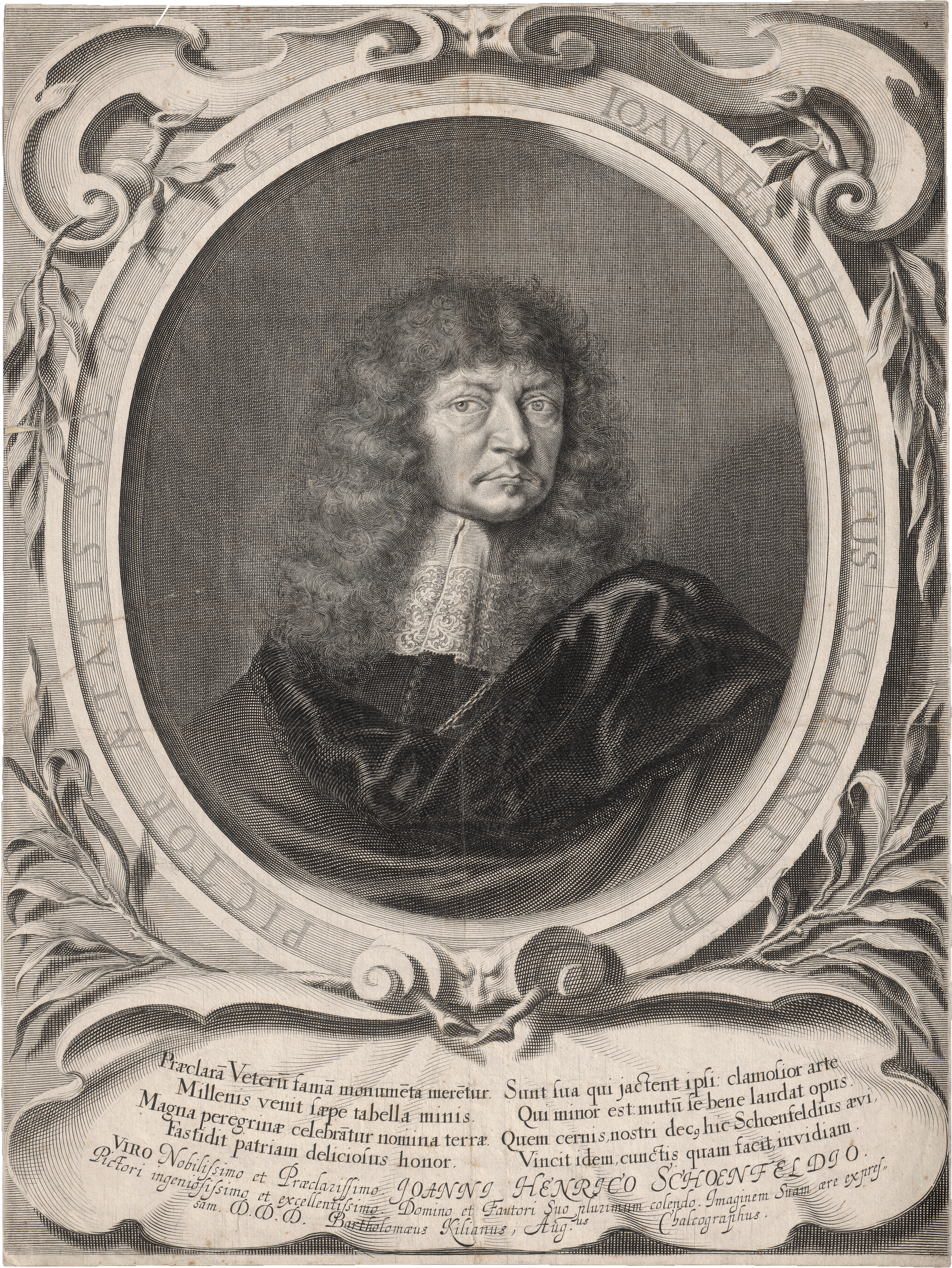 Bildnis des Johann Heinrich Schönfeld (mit blindem Auge). Kupferstich. 40,8 x 30,5 cm. 1671. Hollstein 300. Wz. Mitra mit Stern und M.