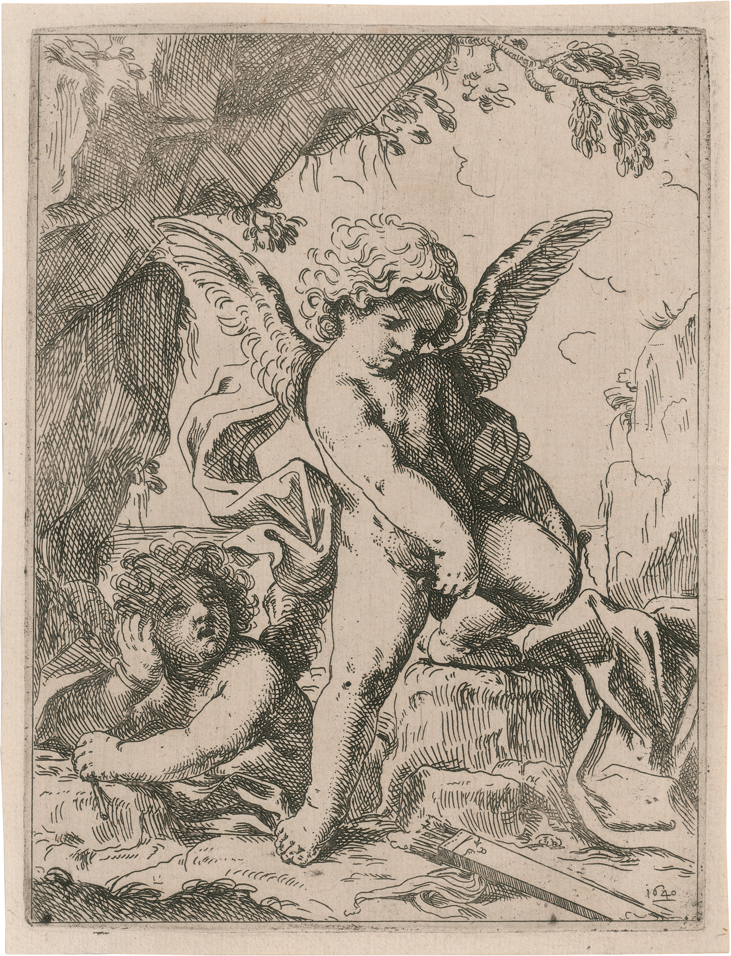 Amor zerbricht seinen Bogen. Radierung. 18,7 x 14,2 cm. 1640. B. XIX, S. 177, 23. Wz. Armbrust im Kreis.