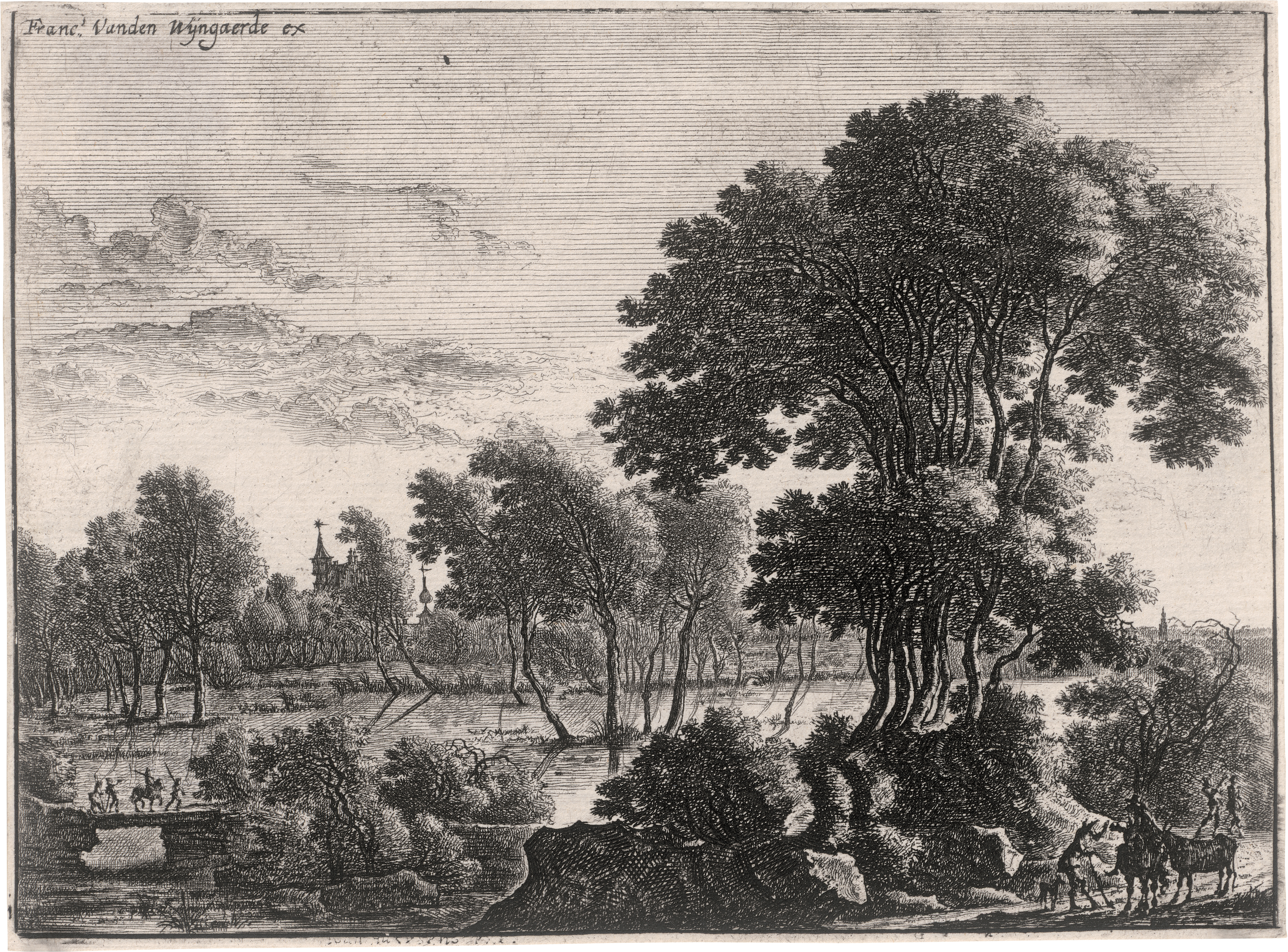 Ganz ausgezeichneter, gegensatzreicher Druck vereinzelt mit zarten Wischkritzeln im Himmel, bis an die Plattenkante geschnitten, teils mit Spuren eines Rändchens. Kleine Montierungsreste verso, sonst tadellos schön erhaltenes Exemplar. Aus einer unbekannten Sammlung "cD" (nicht bei Lugt).