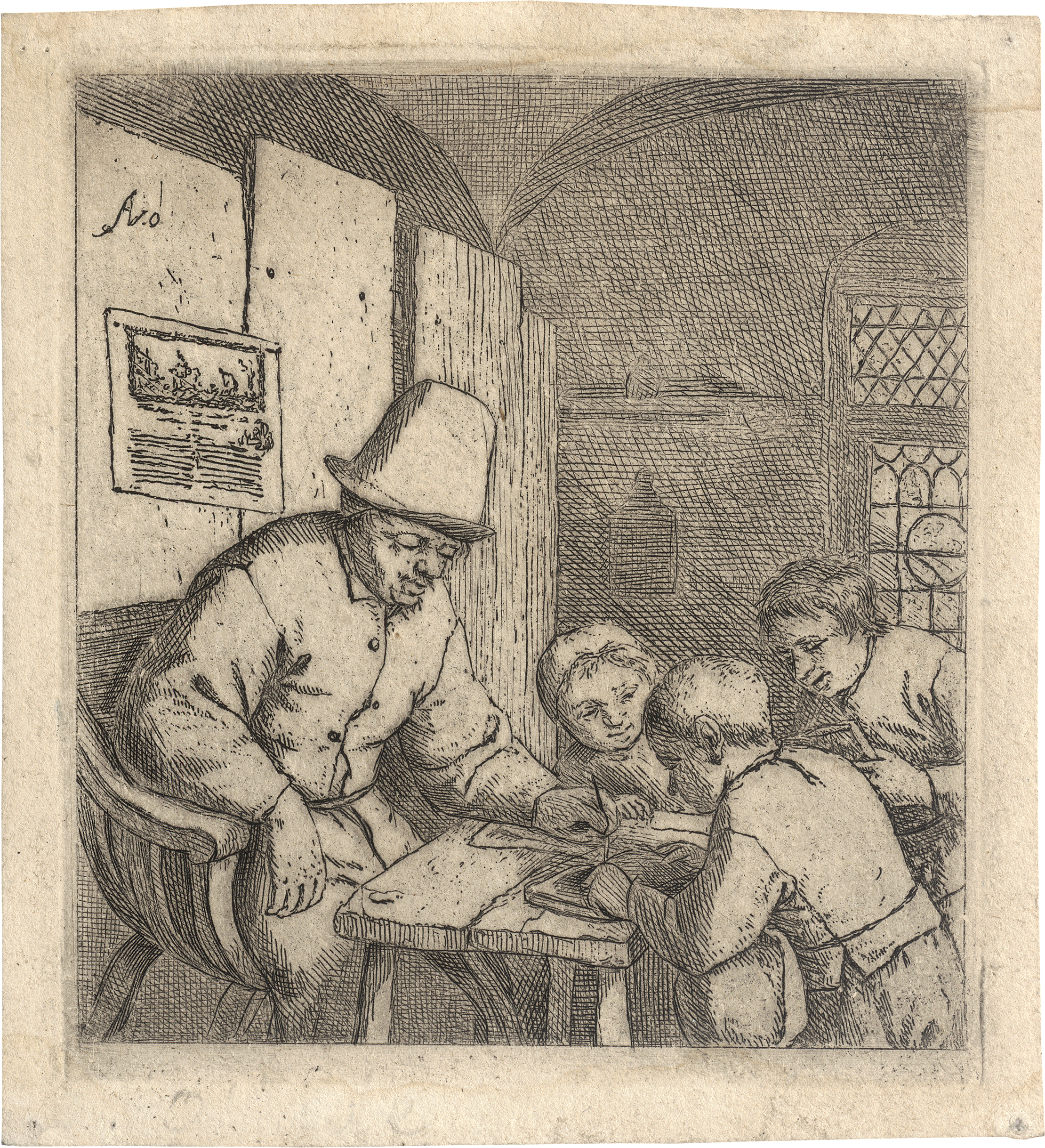 Der Schulmeister. Radierung. 9,1 x 8,2 cm. Um 1644. B. 17, Dutuit 17, Davidsohn 17, Godefroy 17, Hollstein 17, Giordani/Rutgers (New Hollstein) 48 III.
